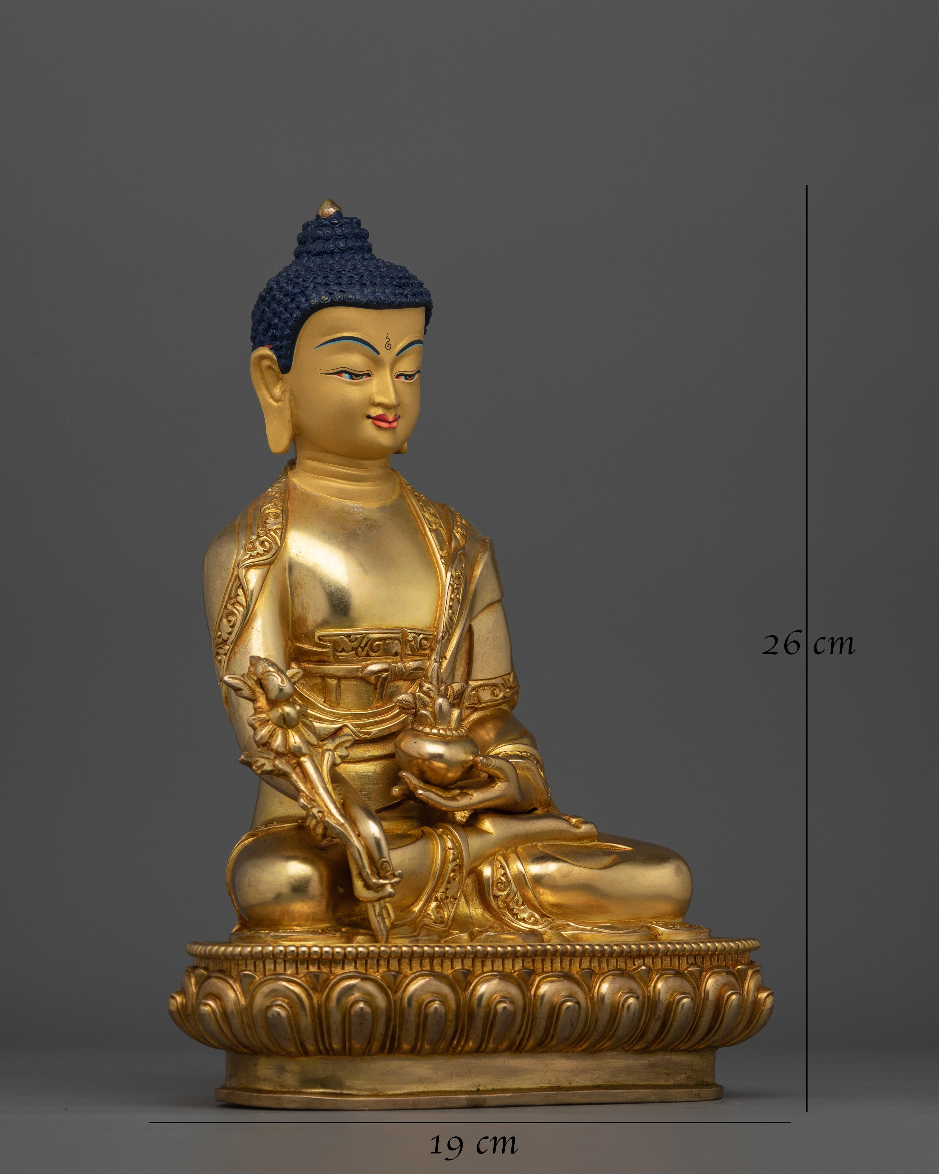 The Vaidurya Prabha Raja (Medicine Buddha) statue, stands at a height of 10.2 inches (26 cm) with a base width of 7.5 inches (19 cm). This exquisite representation is crafted with a copper body and adorned with intricate triple layer 24K gold gilding, enhancing its appearance. The detailing is further enriched with gold and acrylic paintings, showcasing artistry.