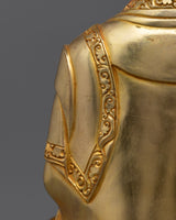 The Medicine Buddha is represented in a calm seated position, holding a medicine bowl in one hand to indicate healing and a myrobalan plant in the other, expressing his compassionate pledge to alleviate suffering. The meticulous workmanship of the gold gilding, mixed with the colorful acrylic paints, brings the statue to life, symbolizing the healing force that Bhaisajyaguru represents in Tibetan Buddhism.