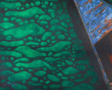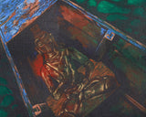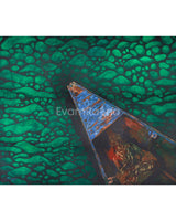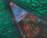 This Stunning Canvas Wall Art is a creative expression of teachings, available in various sizes suitable for multiple spaces. This Print centerpiece portrays the deity seated in a boat, which represents spiritual instruction and enlightenment. The green patterned water, with its changing and flowing patterns, reflects the chaotic turbulence of life's conflicts, but the calm and enlightened figure represents inner serenity and mindfulness. The striking contrast between the light and the dark tones of the river enhances to the artwork's symbolic depth, emphasizing the journey from worldly distractions to spiritual clarity.