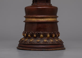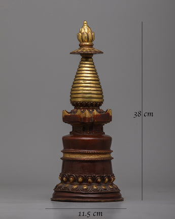 Presenting the Stupa for Tibetan Ritual, a magnificent work of spiritual art with a Copper body expertly sculpted and fire Gold Plated. Measuring 38 centimeters in height, this stupa serves as both a decorative accent and a significant representation of Buddhist practice, intended to encourage and assist in spiritual practices. Its captivating radiance, enhanced by the fire Gold Plating method, heightens the spiritual aura of any area and adds to its hallowed aspect.
