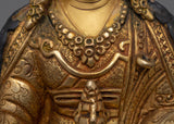With this Tantra Guru Rinpoche Statue, you can encounter the personification of heavenly knowledge. This statue is made of high-quality materials, including a copper body with intricate acrylic paintings and 24K gold gilding, and stands 9.4 inches tall on a robust 6.1-inch base. The commitment and skill of the artists who brought this holy figure to life are evident in every brushstroke and layer of gold. The statue can be used as a focal point for spiritual practice and reflection in meditation rooms or personal altars due to its small size.