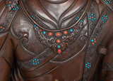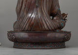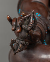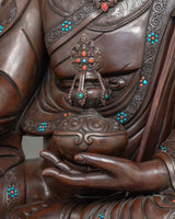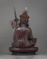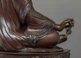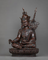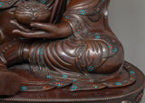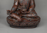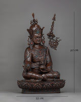 Guru Rinpoche's regal robes and sympathetic look are accentuated by the sturdy and textured finish of this expertly crafted statue, which is made of oxidized copper. Its 43 kg weight emphasizes its solid and venerable presence. Hand-carved gemstones adorn it, adding a touch of holiness and splendor.