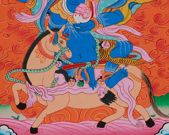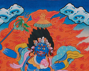 Palden Lhamo, the only female among the Eight Guardian Deities in Tibetan Buddhism, is revered for her protection of the Dharma and the Dalai Lama. Her painting is rich in tantric symbolism, with her wrathful blue form riding a mule through a sea of flames. Adorned with skulls and ritual implements, she symbolizes compassion and spiritual growth. This painting honors Buddhist tradition and serves as a protective talisman and timeless sacred art.
