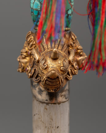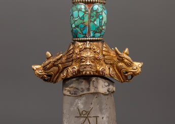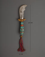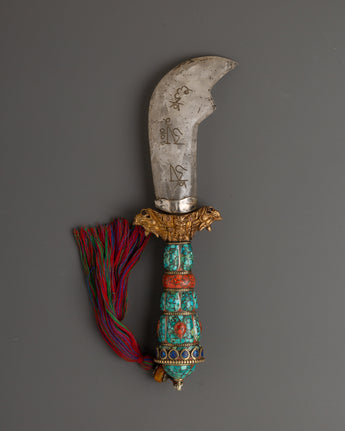 A Tibetan knife, also called a "phurba" or "kila," has cultural and symbolic meaning in Tibetan traditions. The unique three-sided blade of this ceremonial dagger represents the victory over ignorance, desire, and aversion in Buddhism. Tibetan knives, which are adorned with elaborate carvings and frequently have a tripartite handle representing different gods, are an essential part of religious rites, ceremonies, and spiritual practices. In addition to their spiritual significance, these knives might have practical uses in daily life, exhibiting in Tibetan communities a combination of deep cultural symbolism and usefulness.