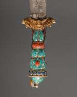 The tantric Crystal Kartika Knife is a practical ceremonial item in spiritual rites and offerings. The knife is handcrafted with precision and has a gold and silver plated copper electroplated craft inlayed with turquoise, lapis lazuli, and coral, all representing protection, knowledge, and life. The blade features deeply engraved carvings, which add to its spiritual meaning and aesthetic attractiveness. A finely added tassel at the base represents Buddhism's unshakable power in compassion and wisdom. This item, 40cm tall and 11cm wide, is a utilitarian ritual object and a beautiful holy art.