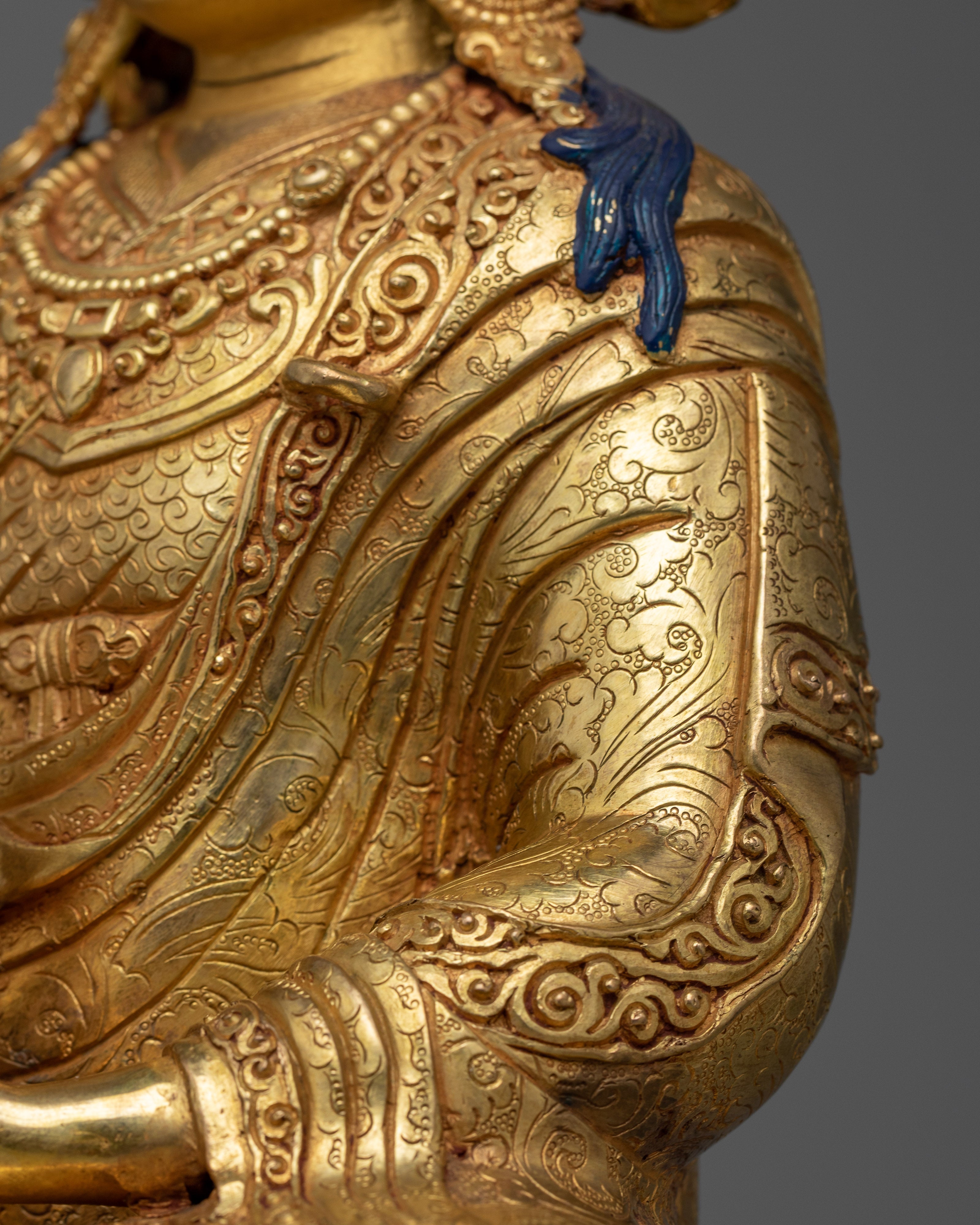 The artistry on this statue is very excellent. The intricate carvings on Padma Rinpoche's robes, the lifelike features of his face, and the delicate patterns on his sacred tools are all enhanced by the rich gold gilding. The acrylic paintings add depth and color to the monument, making it more visually appealing and spiritually significant. This statue is ideal for individuals who want to establish a peaceful and spiritually empowering environment in their home or meditation room.