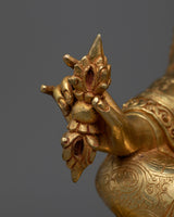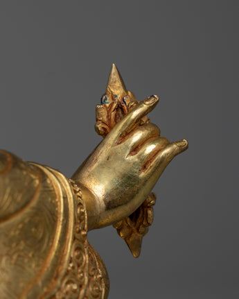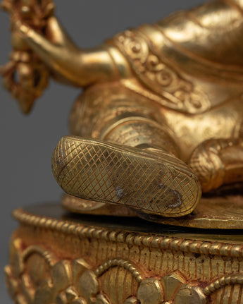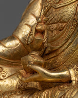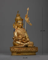 Presenting our "Tantric Padma Rinpoche" statue, a stunning depiction of the legendary tantric teacher. This statue stands 16.1 inches tall and weighs 6.52 kg. It is skillfully crafted from a sturdy copper body and lavishly embellished with 24K gold plating. The gold and acrylic paints highlight the precise features of Padma Rinpoche's tranquil demeanor, ornate tantric costume, and symbolic artifacts he holds, which represent profound tantric insight and spiritual strength.