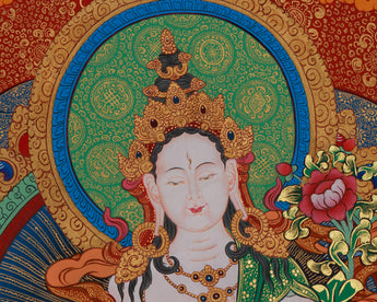 This magnificent Tara with Buddhas and Bodhisattvas Thangka has White Tara as its central figure, representing compassion, healing, and longevity in the Tibetan Buddhist tradition. This Thangka is hand-painted in the traditional style by a skilled Nepali artist, ensuring the highest quality. Cotton canvas produces the artwork, giving the detailed painting a strong and long-lasting base. The acrylic colors enhance the image's depth and vibrancy, perfectly conveying White Tara's knowledge and divine tranquility. The Thangka's divine quality is further enhanced by the exquisite use of genuine 24K gold throughout the artwork, highlighting the sacred aspects.