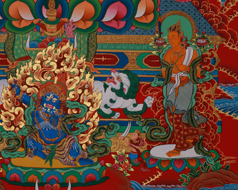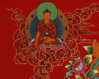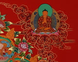White Tara, associated with longevity, health, and knowledge, is depicted with seven eyes, holding a lotus for purity and extending her right hand for protection. She is surrounded by Buddhas and Bodhisattvas, including Shakyamuni Buddha and Amitabha Buddha, who embody enlightenment and serenity. The Bodhisattvas Chenrezig, Vajrapani, and Manjushri, who stand for compassion, power, and knowledge, appear beneath White Tara. Vajrapani uses the vajra to defeat negativity, Chenrezig represents unbounded compassion, and Manjushri's sword pierces ignorance and leads beings to enlightenment. More than just a work of art, this Thangka of Tara with Buddhas and Bodhisattvas serves as a spiritual doorway, providing visual direction on the journey to enlightenment, longevity, and awakening.