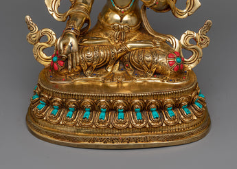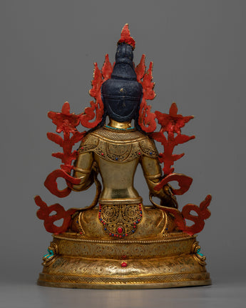 With three eyes on her face and one on each palm and sole in her unique incarnation, Tara represents her omniscient awareness and unwavering attention to creatures' suffering. These seven eyes enable Tara to see all beings' needs and respond with swift and appropriate compassion. The intricate detailing of the sculpture, from Tara's serene and knowing expression to the elaborate designs of her robes, throne, and the lotus she sits upon, reflects her divine qualities and role as a protector and guide toward enlightenment.