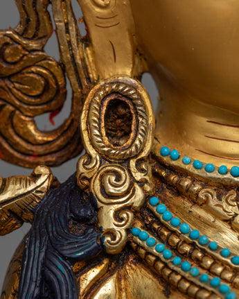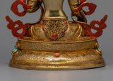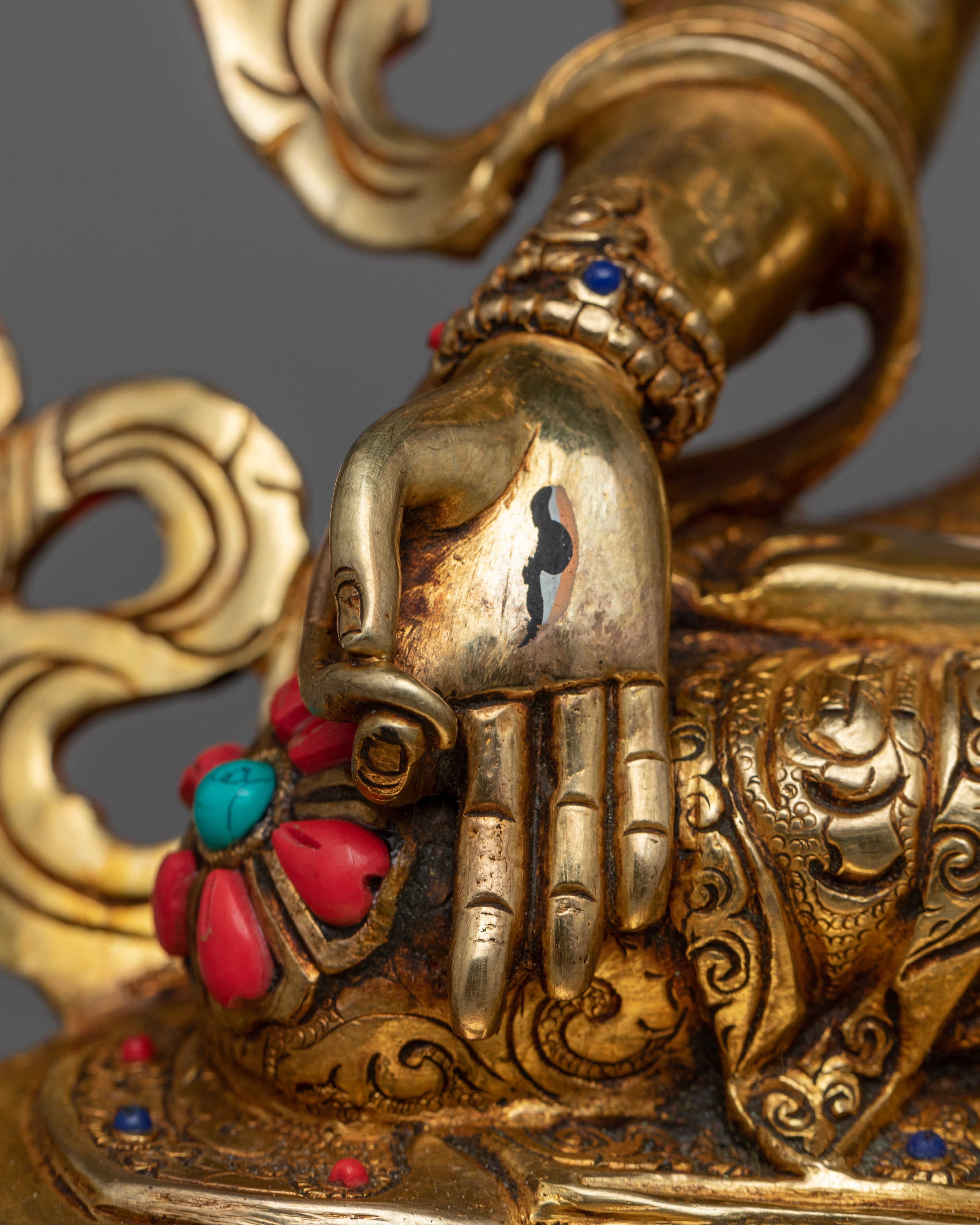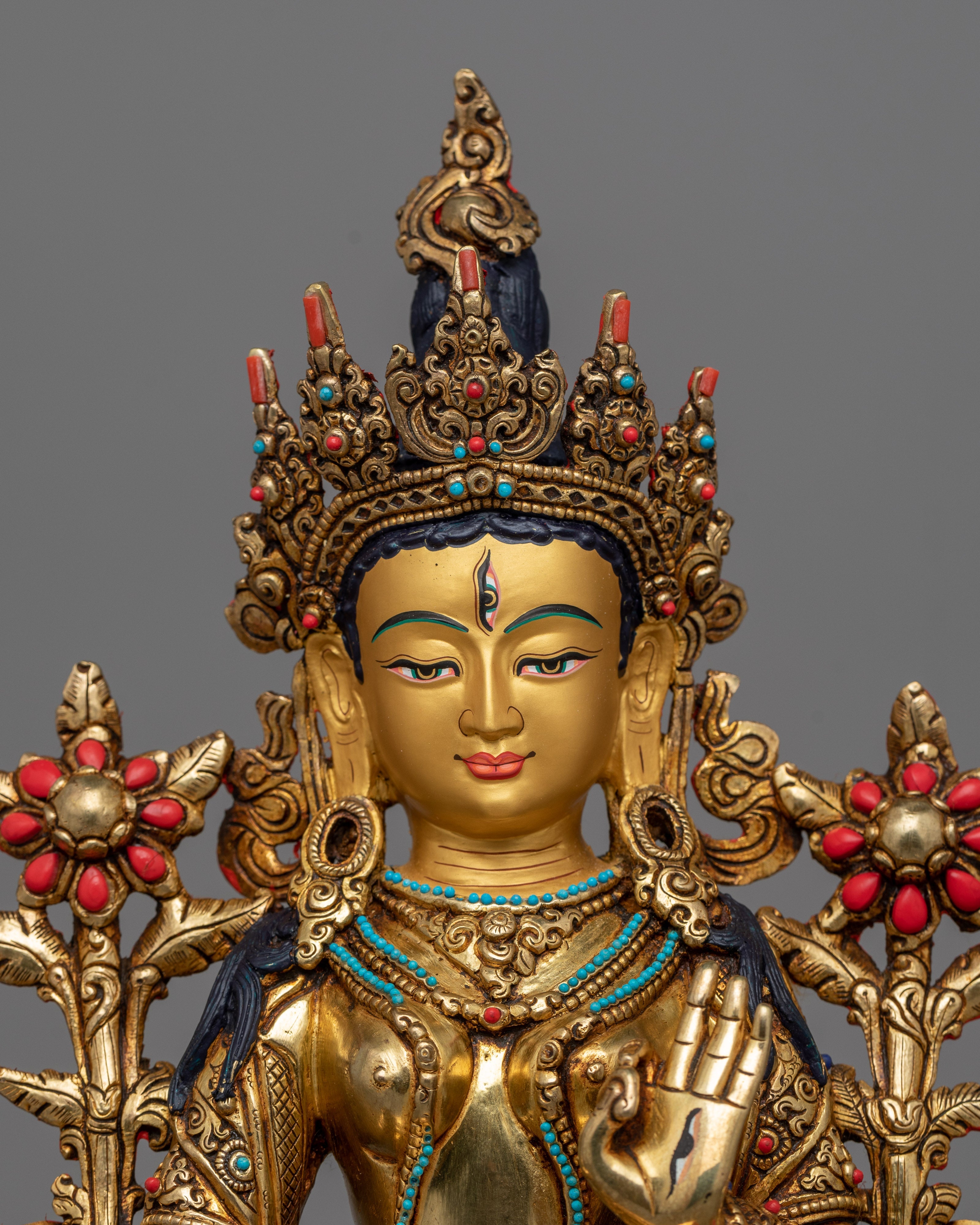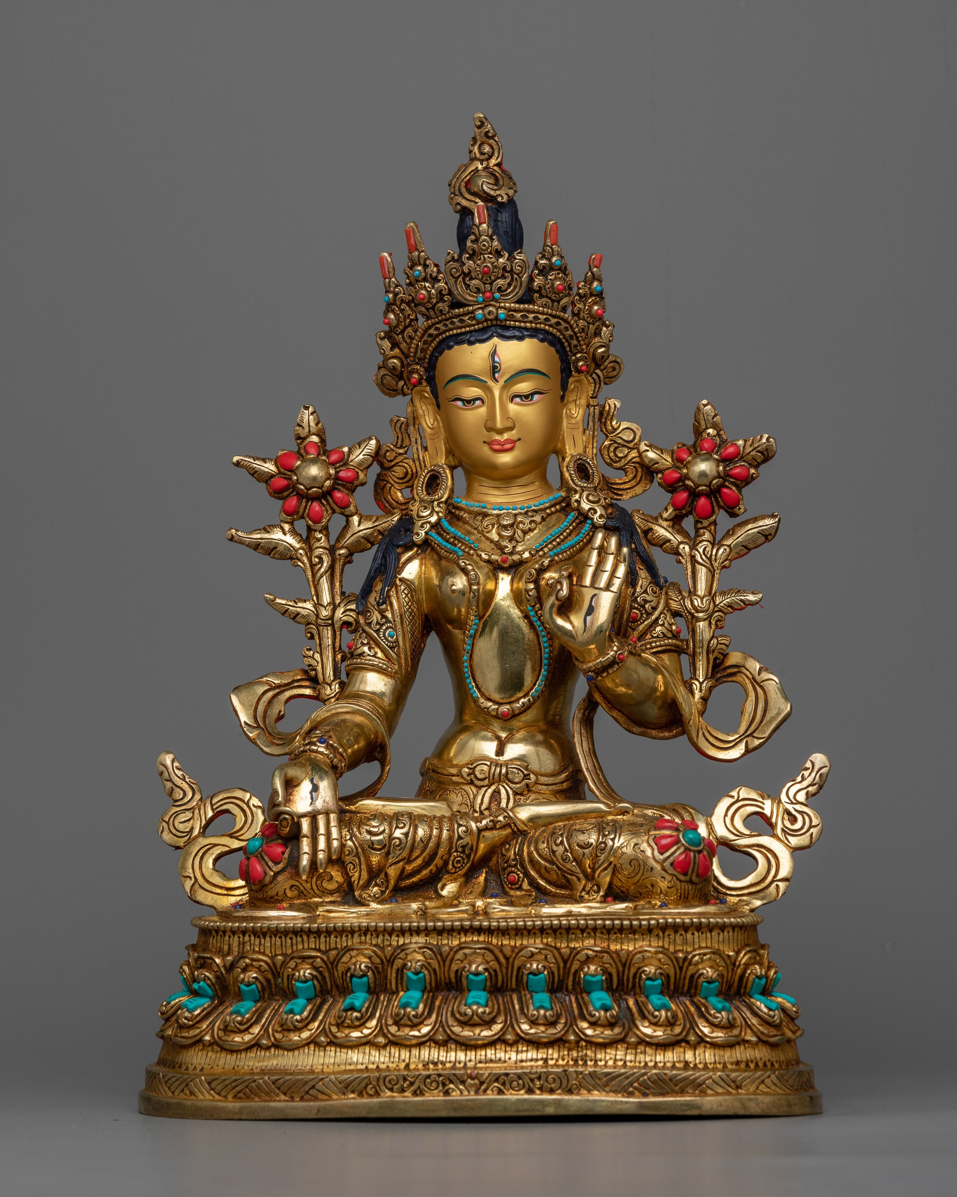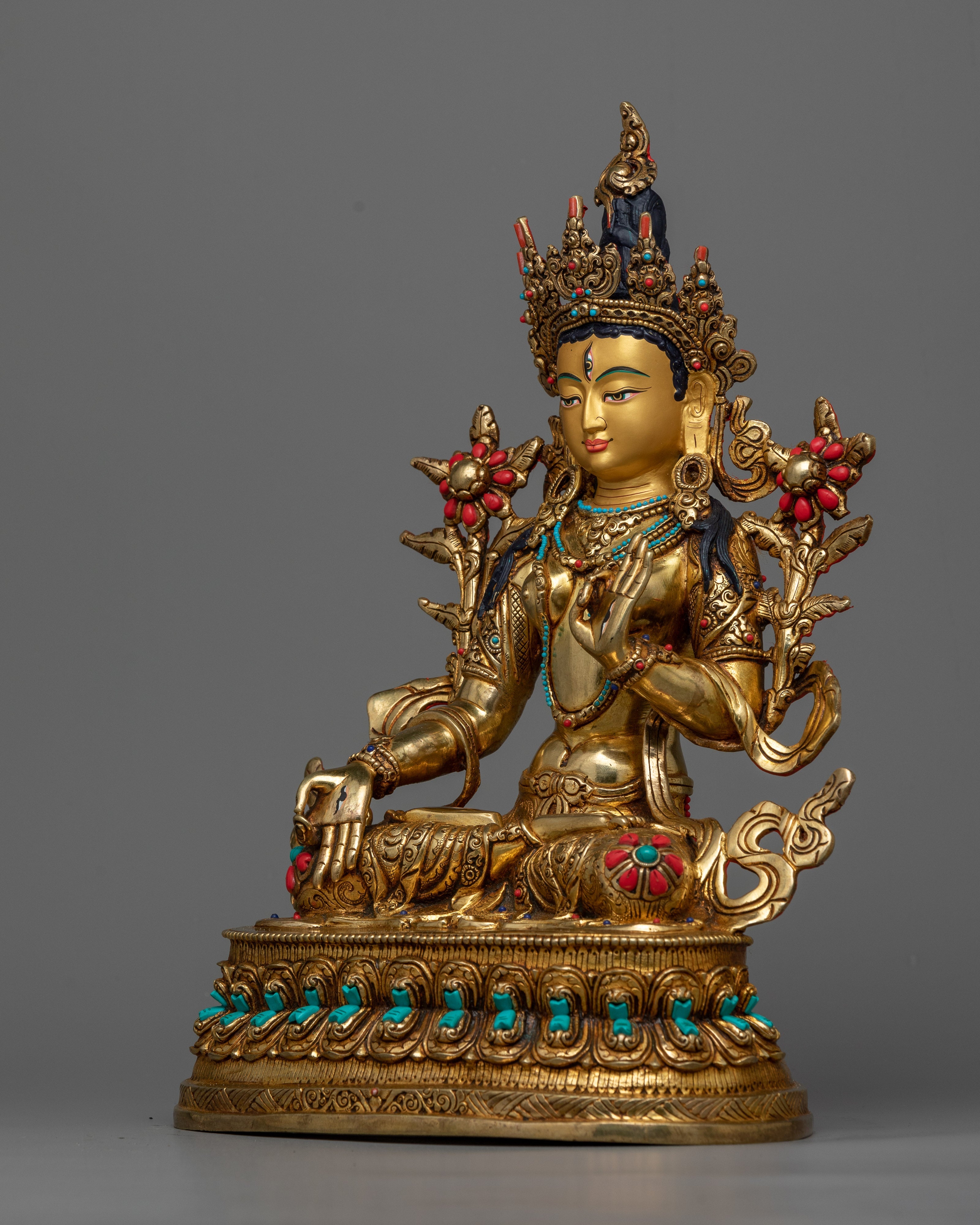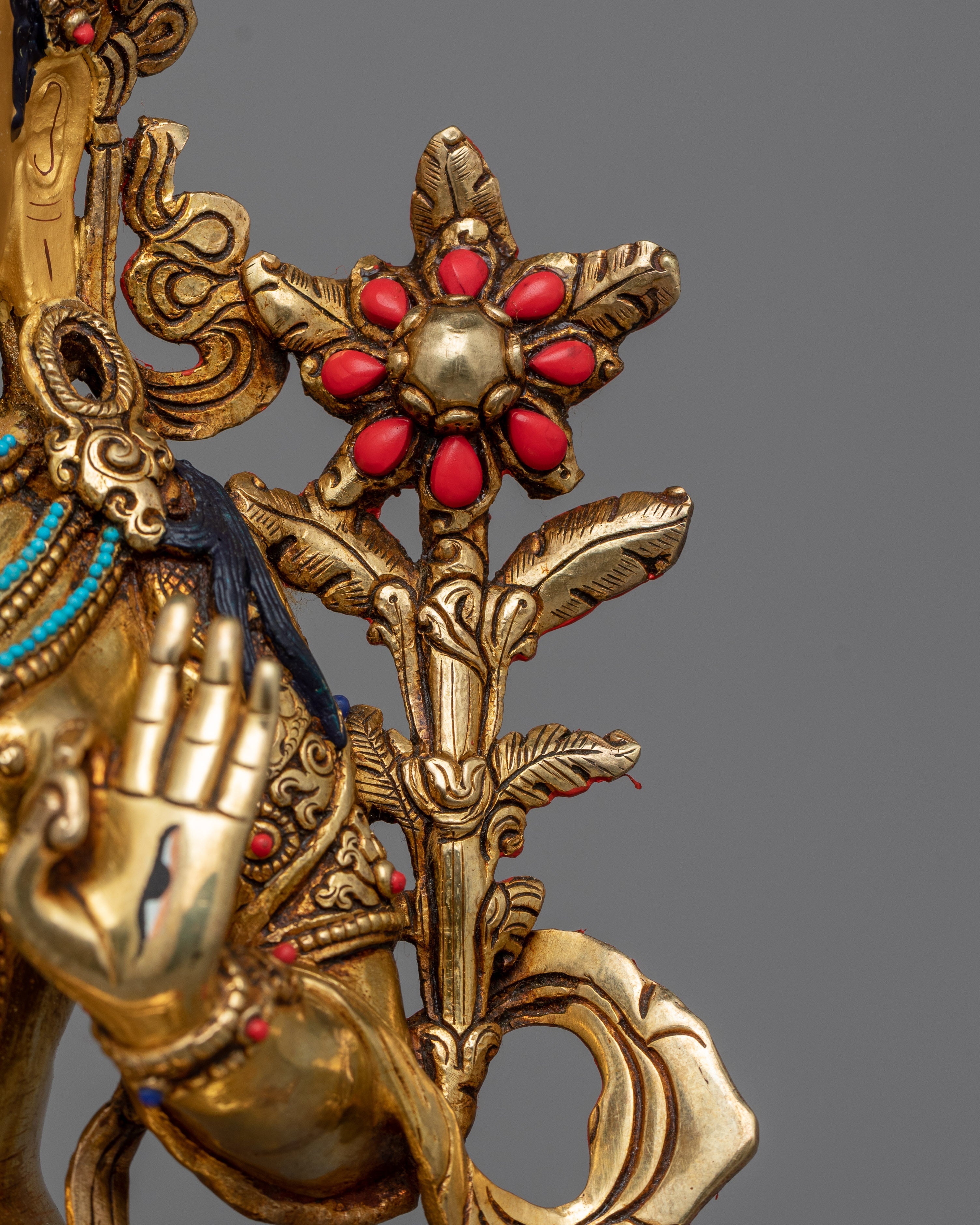 Presenting the sculpture Tara with Seven Eyes, a singular and profoundly spiritual representation of Tara, the female Bodhisattva known for her unending compassion and willingness to help those in need. This statue, which measures 13.4 inches by 9.4 inches at the base and weighs 3.55 kg, represents Tara's intense awareness and caring gaze throughout the six realms of existence. It depicts Tara's ethereal beauty and profound spiritual presence through hand-carved jewels, acrylic and gold paintings, and a copper body gilded with 24K gold.