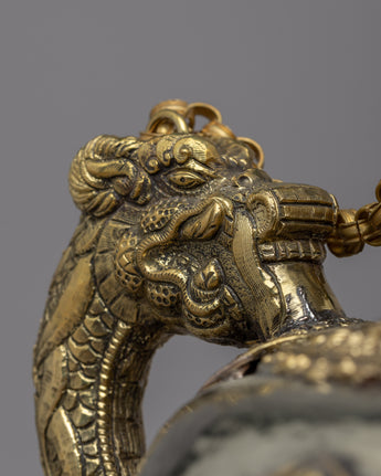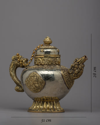 Our Tibetan Tea Pot Kettle, painstakingly made by talented artisans from white metal and brass, is a magnificent fusion of history and beauty. Standing at a height of 28 cm and weighing 2.256 kg, it represents ageless beauty and cultural legacy. Even though its main purpose may be decorative, its fine detailing and complex design make it a captivating focal point in any space.