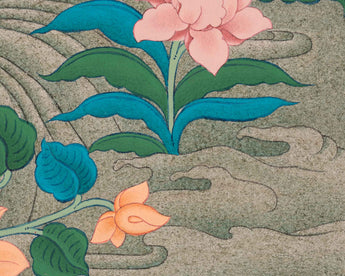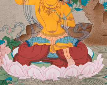 The "Thangka Artistry of Manjushri" represents a pinnacle of human creativity and spiritual reverence. Meticulously handcrafted on the finest cotton canvas, this masterpiece is a harmonious fusion of poster colors, emulsion, and genuine 24K gold, creating an artwork that exudes an ethereal radiance. Manjushri, the embodiment of supreme wisdom, is brought to life in exquisite detail, emanating an aura of profound enlightenment. Beyond being a mere piece of art, this Thangka is a gateway to the realm of wisdom itself. Manjushri's gaze, captured with unparalleled skill, becomes an enduring source of inspiration and guidance, inviting you to embark on a transformative journey towards inner wisdom and enlightenment. Every contemplation of this Thangka deepens your connection to the Bodhisattva's boundless wisdom, enveloping your space in a transcendent atmosphere of spiritual insight and growth.