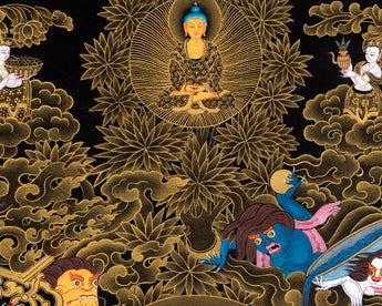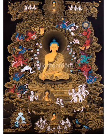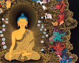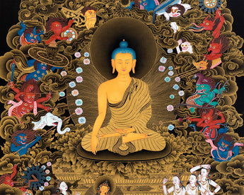 Buddha is seated on the lotus throne in the center of this Buddha Shakyamuni thangka, surrounded by MARA's minions. This thangka empowers comprehension because of the detailed linings in pure 24K Gold and a combination of various Acrylic Colors. We have used an exquisite color palette to paint this thangka, which helps to focus on the central Buddha and the beautifully depicted life stories of him.