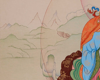 This thangka depicts the enlightened master Guru Rinpoche, a revered figure in Tibetan Buddhism. It is hand-painted on fine cotton canvas with natural stone colors and detailed with genuine gold. The intricate detailing highlights his divine attributes, while the layering of natural stone colors adds depth and clarity. The use of gold enhances the luminous quality of his crown, ornaments, and sacred objects. It is created in the Karma Gadri style, a traditional Tibetan painting method known for its spacious composition and soft color tones. The flowing landscapes and balanced elements embody the peaceful, transformative energy associated with Guru Rinpoche. The gentle gradients and smooth lines emphasize the painting's vibrancy and spiritual richness.