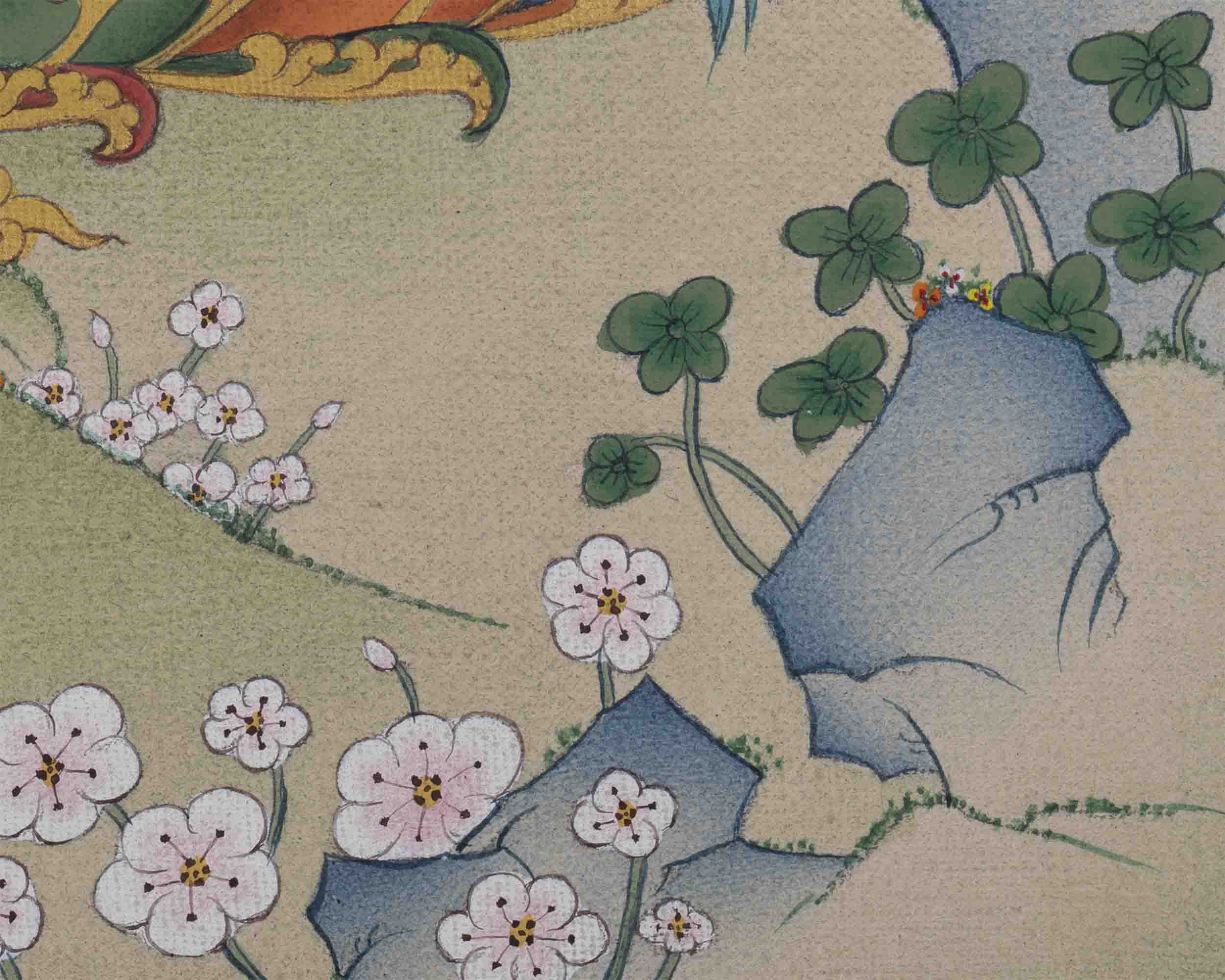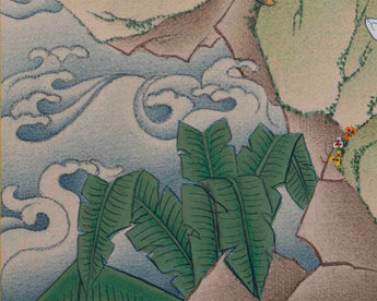 Experience a transcendental visual journey as the story of our Green Tara Goddess Thangka is revealed on a fine cotton canvas, providing an opulent smooth surface for the fine details that highlight the grace of this kind goddess. Capturing the essence of Green Tara's divine energy, the colors of natural stone are expertly blended to create a vibrant and harmonious palette. Delicate details are meticulously highlighted with the luminosity of 24K gold to elevate the sacred artistry; this symbolizes the transcendence of Green Tara and imbues the entire composition with an air of opulence and spirituality.