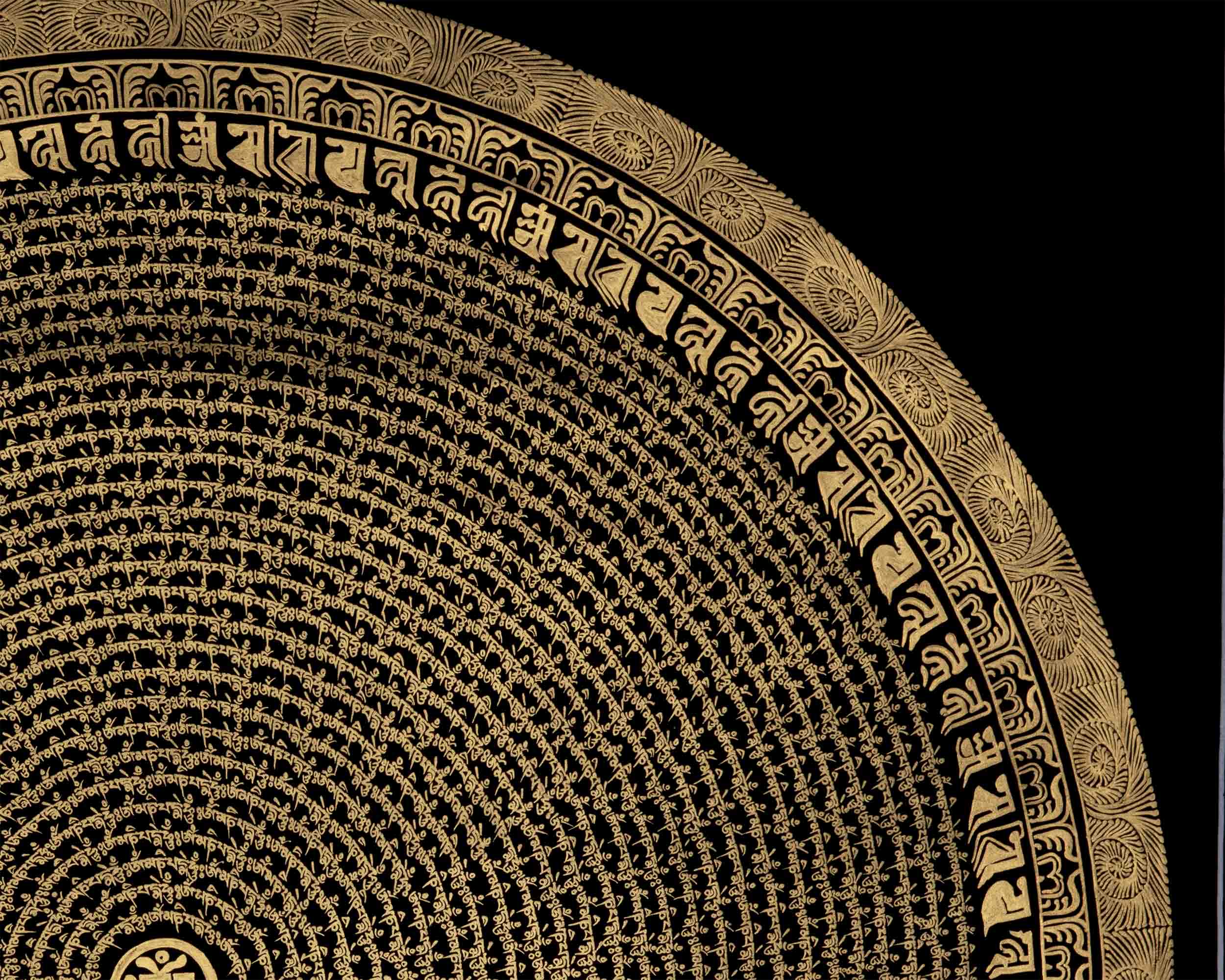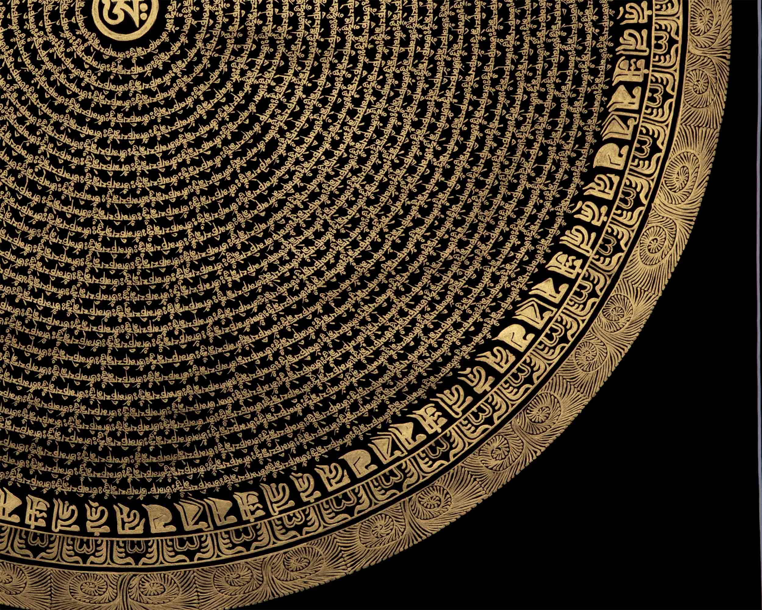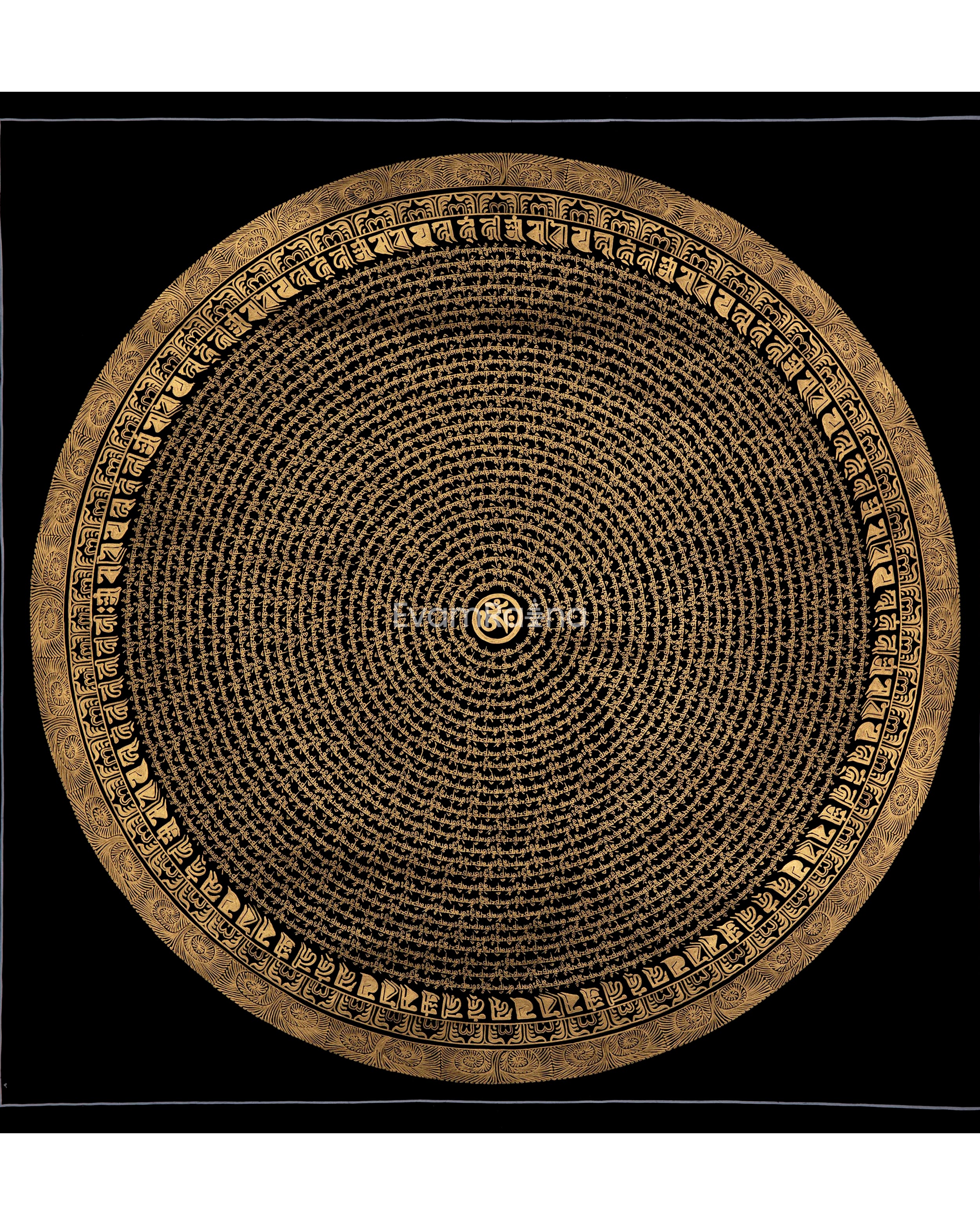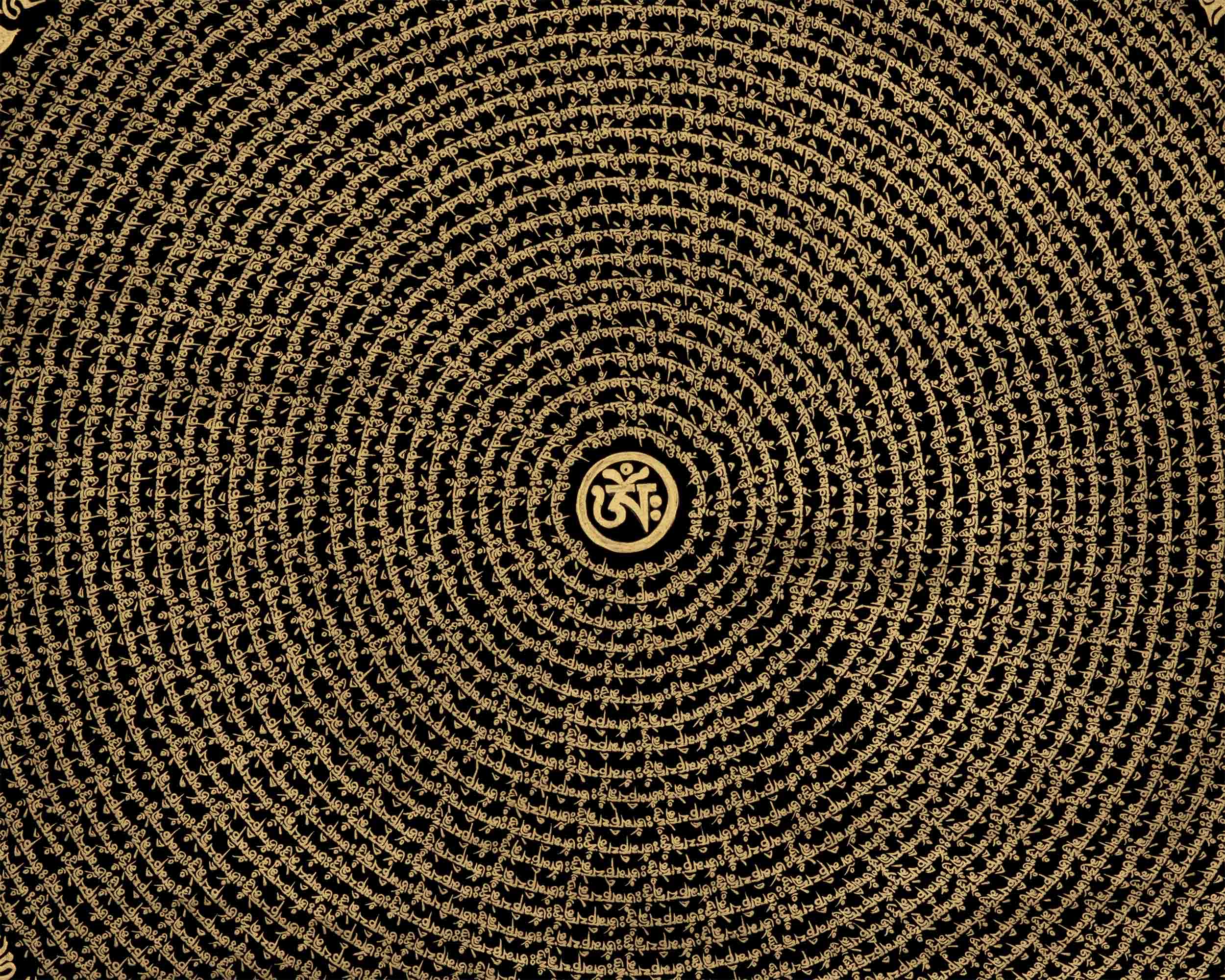 Introducing the enchanting Circular Om Mandala Thangka, a work of art that represents the cyclical nature of existence and spiritual harmony. This amazing piece of art has a circular pattern that is perfectly balanced and expresses the idea of infinite connectivity. The mystical Om sign, which represents the unchanging sound of creation, shines with heavenly force at its heart. The Circular Om Mandala Thangka, which was diligently painted with fine detail, inspires viewers to explore the depths of their own awareness. You can embark on a transforming path of self-discovery and spiritual awakening by displaying this precious artwork in your home and allowing its circular form and the symbol Om to serve as your guides. Enjoy the Circular Om Mandala's mesmerizing beauty and appreciate the connectivity of all life.