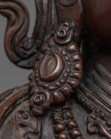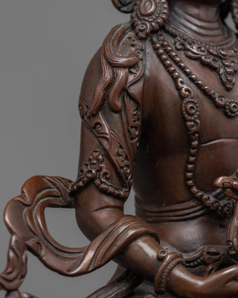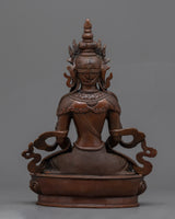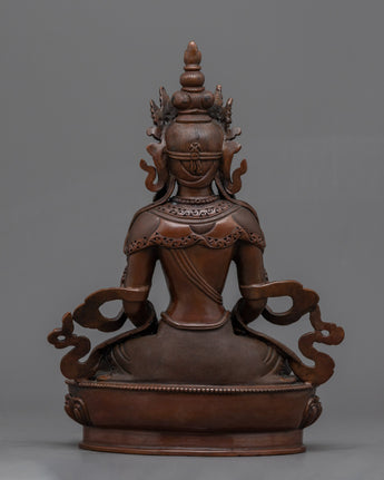 Our Amitayus Buddha statue is a sacred beacon for individuals on a spiritual journey, revealing a portal to endless life and unlimited luminosity. This carefully wrought oxidized copper statue bears witness to Amitayus, the Buddha of Infinite Life's continuing appeal and profound significance.