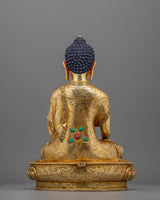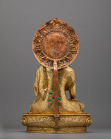This Shakyamuni Buddha, also known as "The Awakened One," radiates calm and profound knowledge, embodying the essence of enlightenment and compassion. This sculpture measures 16.3"/41.5cm (Height) x 9.6"/24.5cm (Base) and weighs 5.78 kg. It is precisely created from a 24K gold-gilded copper body with gold and acrylic paints, demonstrating craftsmanship.