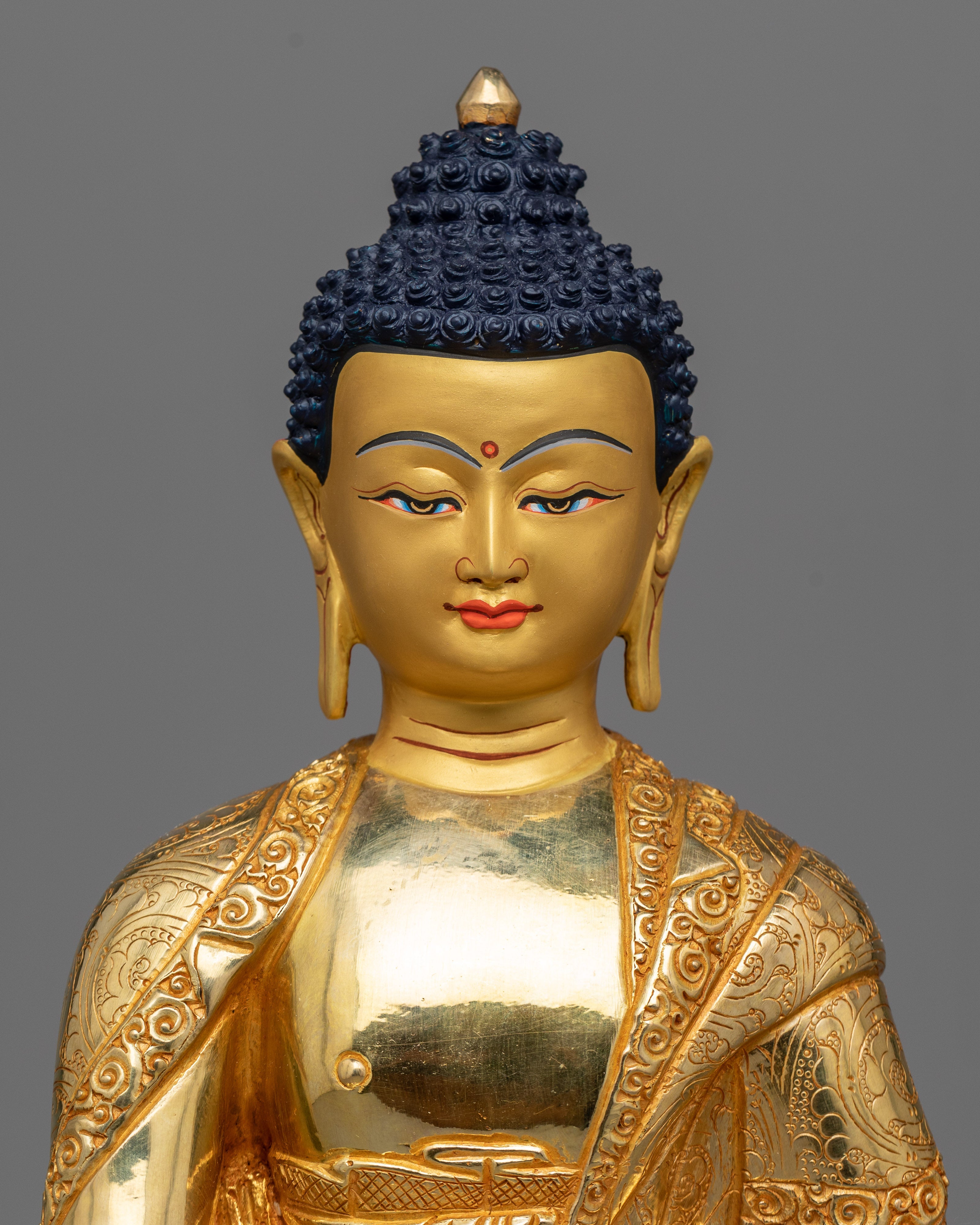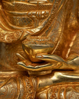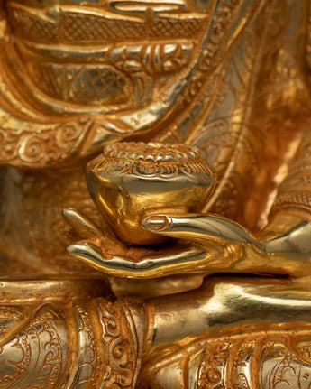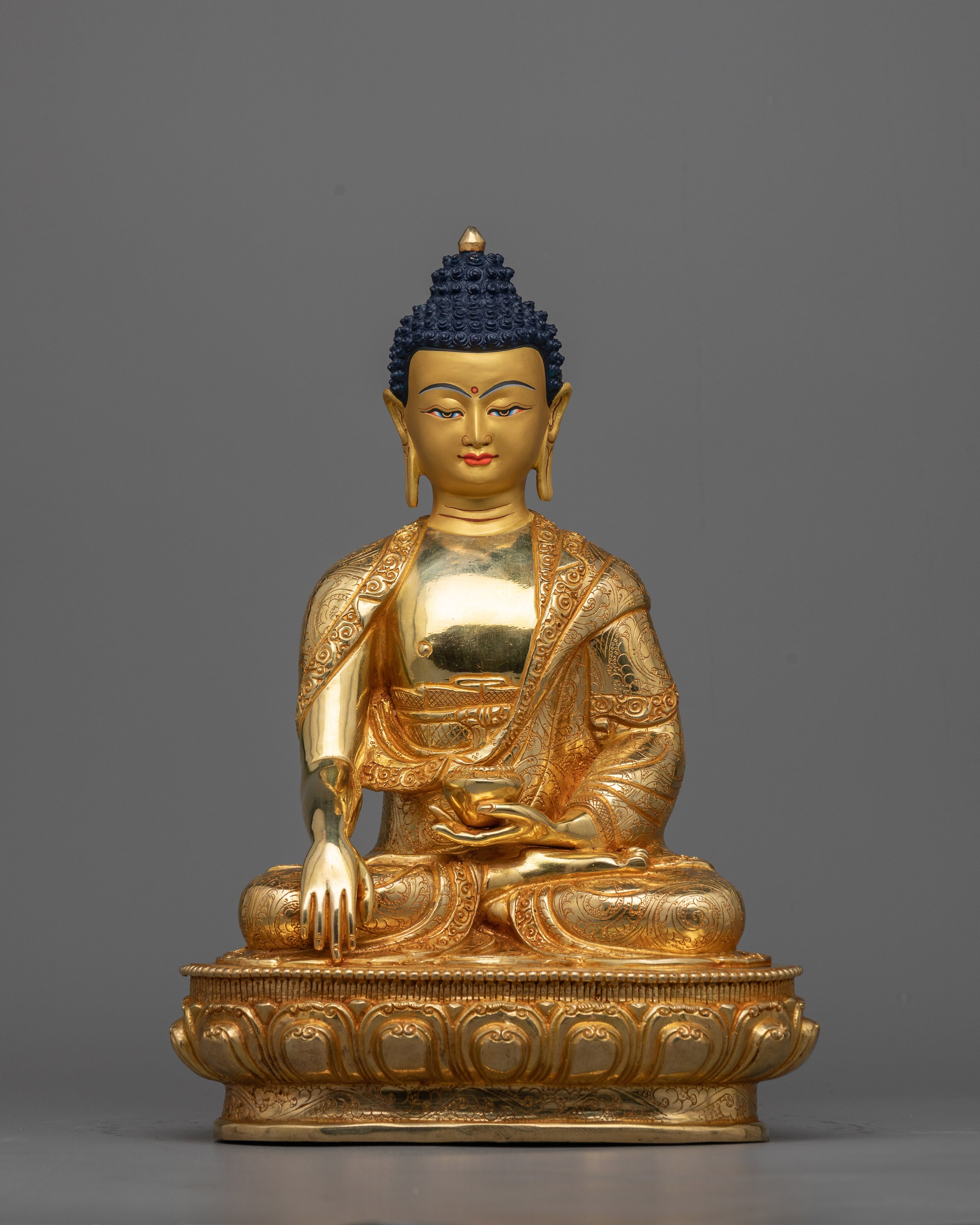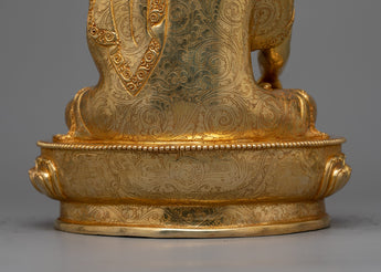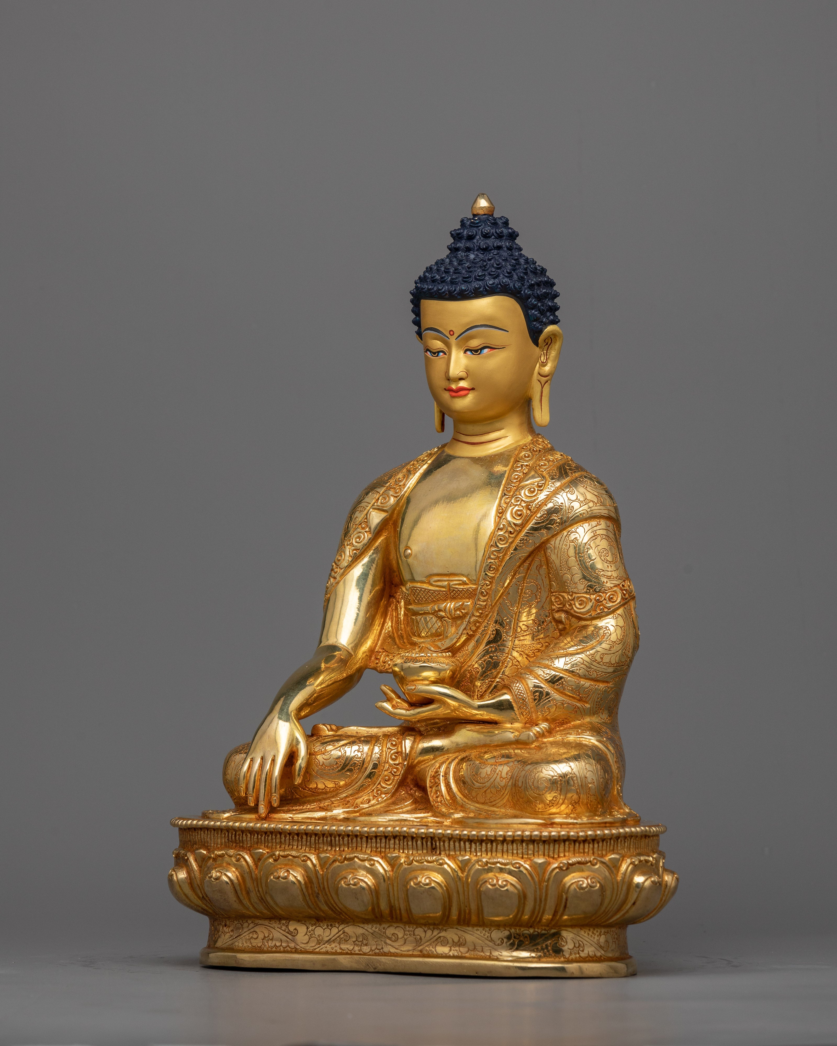 The Awakened Shakyamuni Buddha Statue is a timeless representation of spiritual development and enlightenment. This 13-inch-tall statue, which was made with great attention to detail, exudes calm and inner peace. Constructed with a copper body, 24K gold plating, and paintings in gold and acrylic, it emanates a celestial presence that encourages introspection.