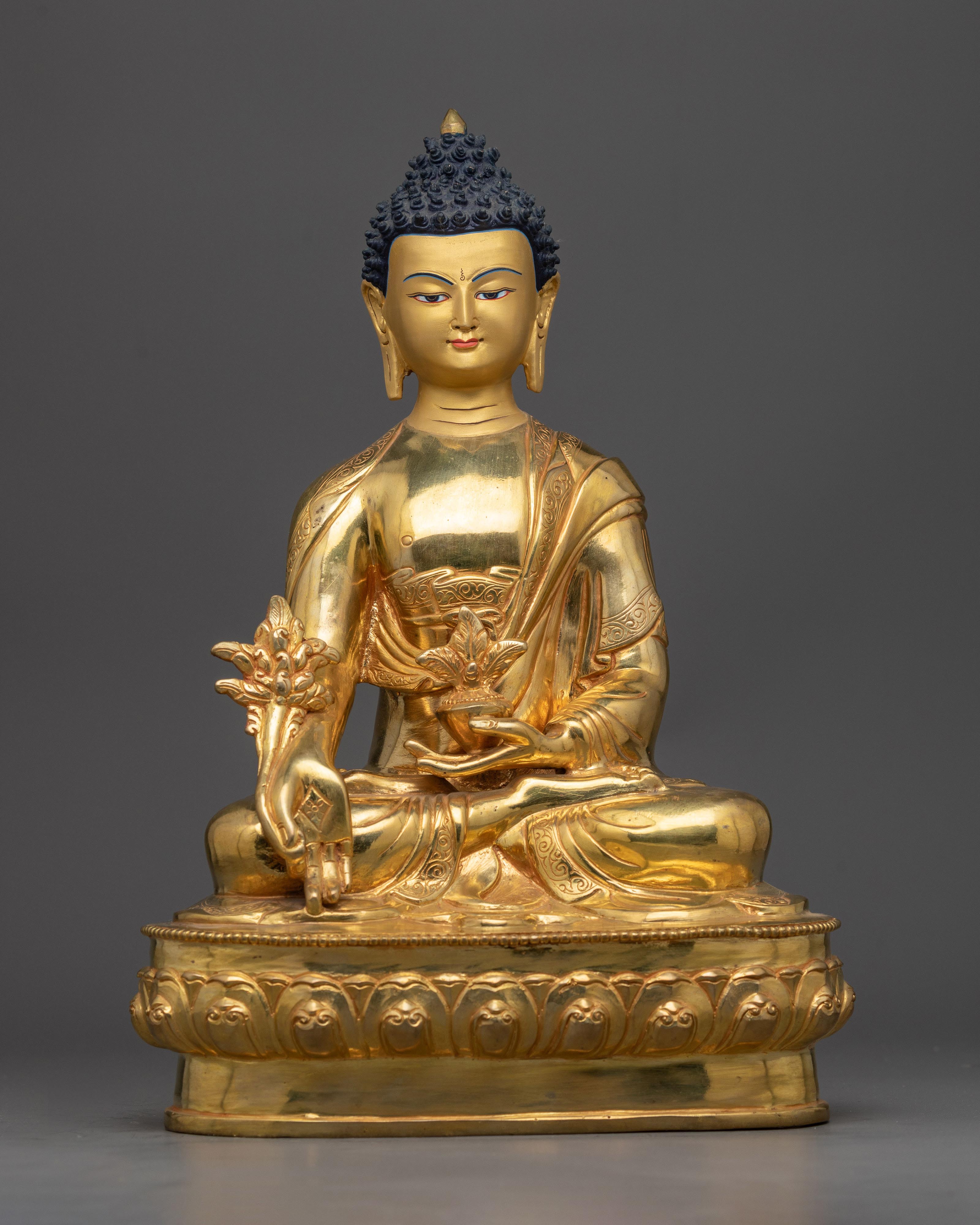 The Bhaisajya Guru Buddha is portrayed with his right hand in the gesture of bestowing blessings, denoting his capacity to treat illnesses of the body, mind, and spirit, and his left hand holding a medicine bowl, symbolizing the healing nectar of immortality. The radiant gold gilding illuminates the sculpture, reflecting the Buddha's role as a beacon of purity, health, and spiritual well-being, guiding practitioners towards healing and enlightenment.