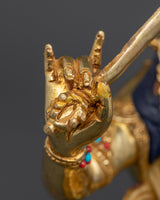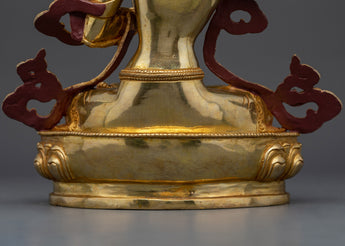 Manjushri is depicted seated in a meditative posture. His right-hand holds the flaming sword, symbolizing the power to cut through ignorance, while his left-hand cradles the Prajnaparamita Sutra, representing the ultimate wisdom. His calm and enlightened expression reflects his deep connection to wisdom and compassion, offering spiritual guidance to all who seek his blessings.