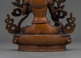 Introducing the stunning Bodhisattva White Tara Sculpture, a Buddhist icon of compassion, longevity, and healing. Standing 8.6 inches tall and resting above a 7-inch base, this 1.57 kg sculpture embodies White Tara's gentle strength and protecting force. Crafted with skill from an oxidized copper body, this item embodies the essence of White Tara's pledge to provide protection and healing to all sentient beings, as well as an aura of ancient wisdom and eternal generosity.