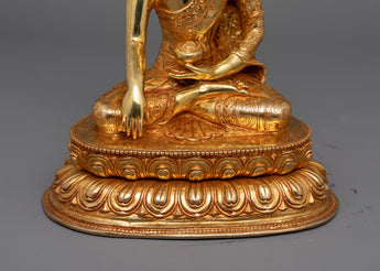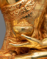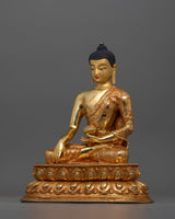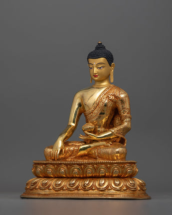 The Buddha of The Shakyas (Shakyamuni Buddha), stands at a height of 11.2 inches (28.5 cm) with a base width of 9.6 inches (24.5 cm), making it an impressive and serene presence in any space. Crafted from a copper body, the statue is adorned with 24K gold gilding that enhances its divine and radiant quality. The intricate gold and acrylic paintings bring vibrant life to the figure.