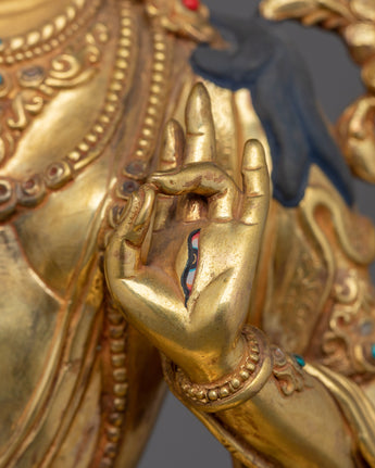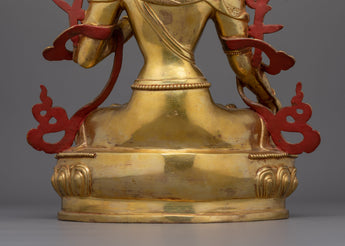 The Buddhist Feminine Deity White Tara Figurine is a serene and powerful depiction of White Tara, the symbol of compassion, healing, and longevity. This statue, standing at 12.6"/32cm in height with a base width of 9.1"/23cm and weighing 3.02 kg, is precisely carved from 24K gold-gilded copper and adorned with gold and acrylic paintings, producing a luminous presence of spiritual grace.