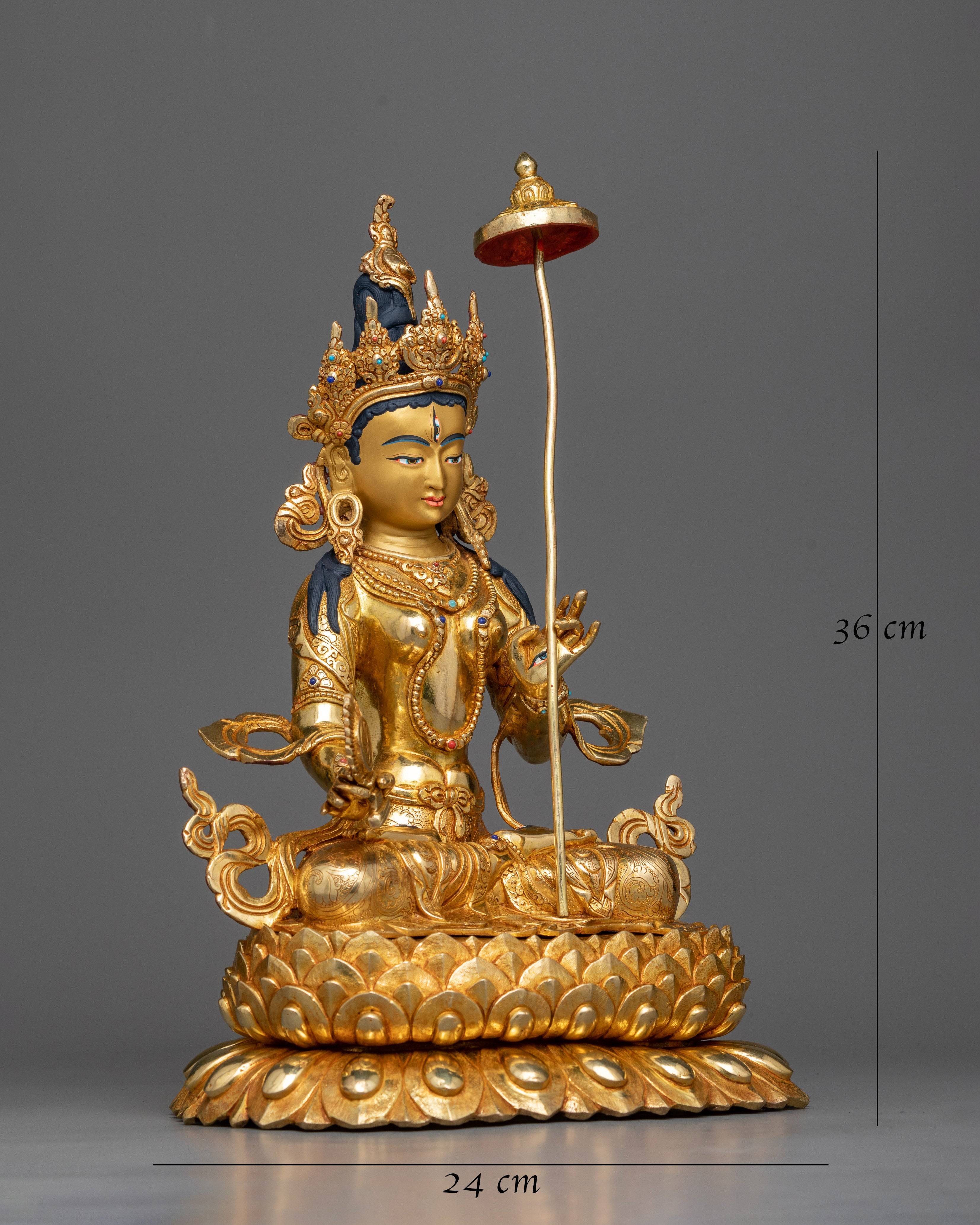 Introducing the Chatra Tara Statue, a pantheon of Tibetan Buddhism's holy manifestation of protection and caring care. With a height of 14.1 inches and a base measuring 9.4 inches, this statue, weighing 4.14 kg, depicts Tara in her protective umbrella (chatra), signifying her function as a guardian against all physical and spiritual damage. Tara is defined as a tranquil yet strong presence. This artwork, made of a copper body with intricate gold and acrylic paints and 24K gold gilding, depicts Tara's unwavering kindness and graceful protection.