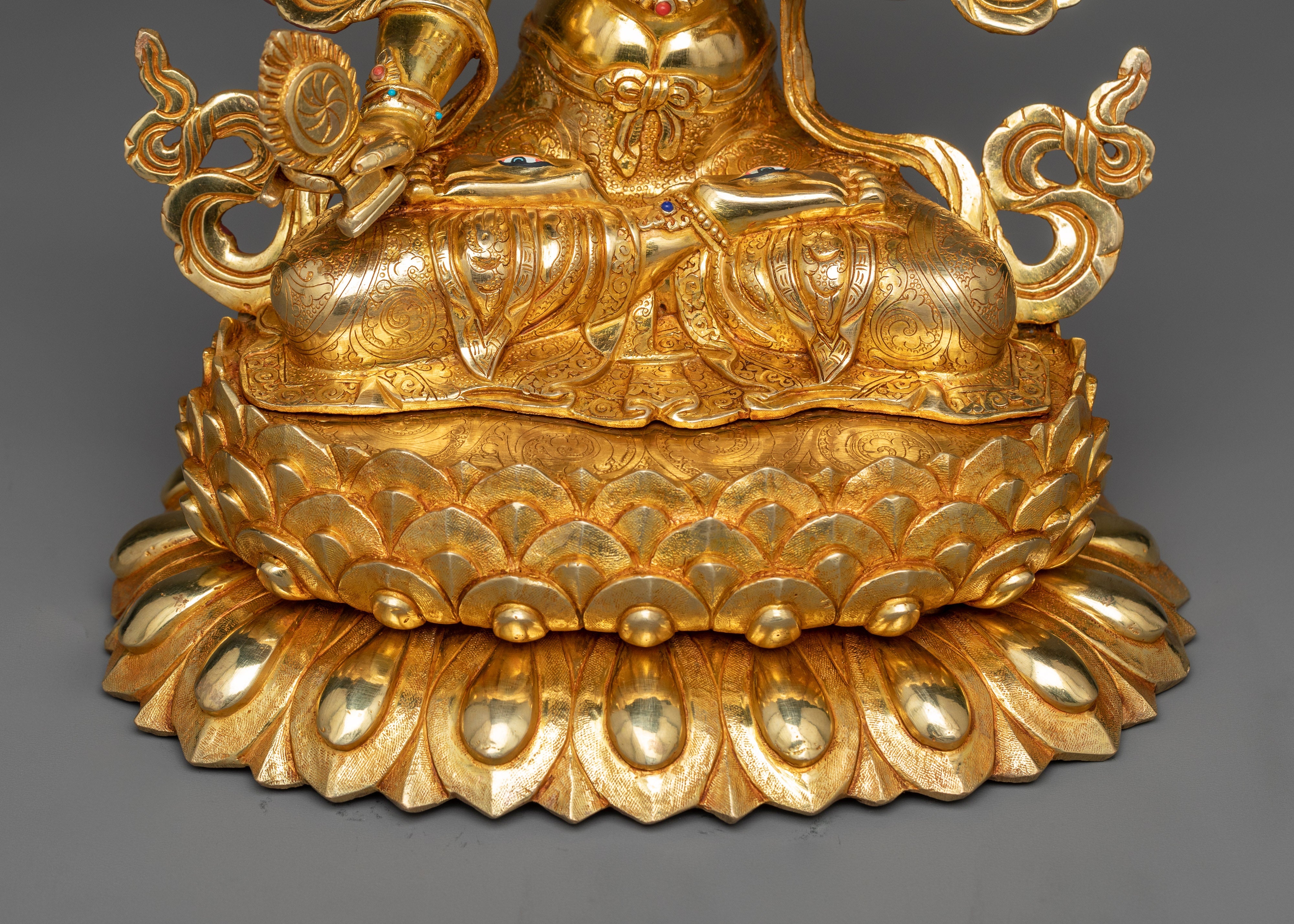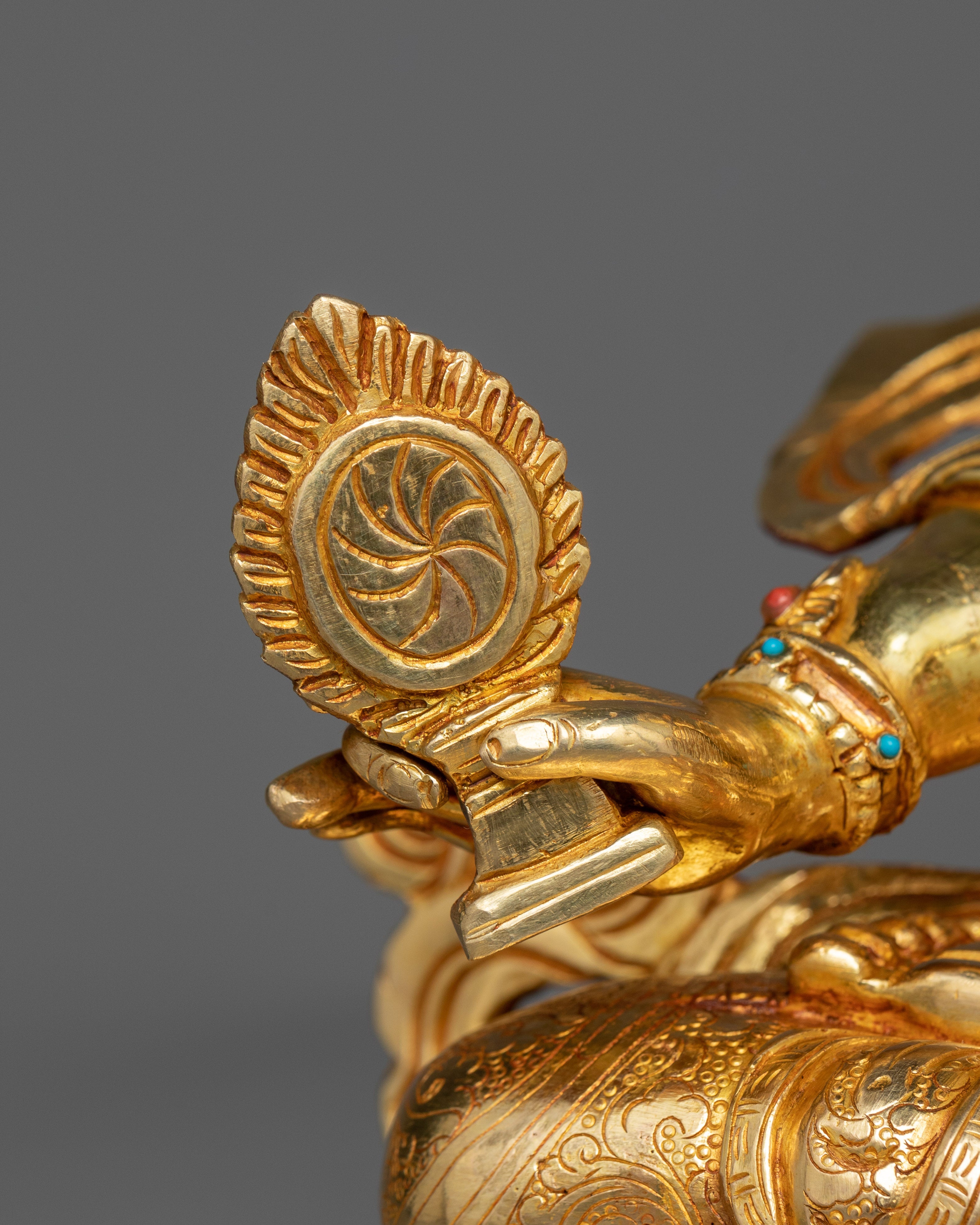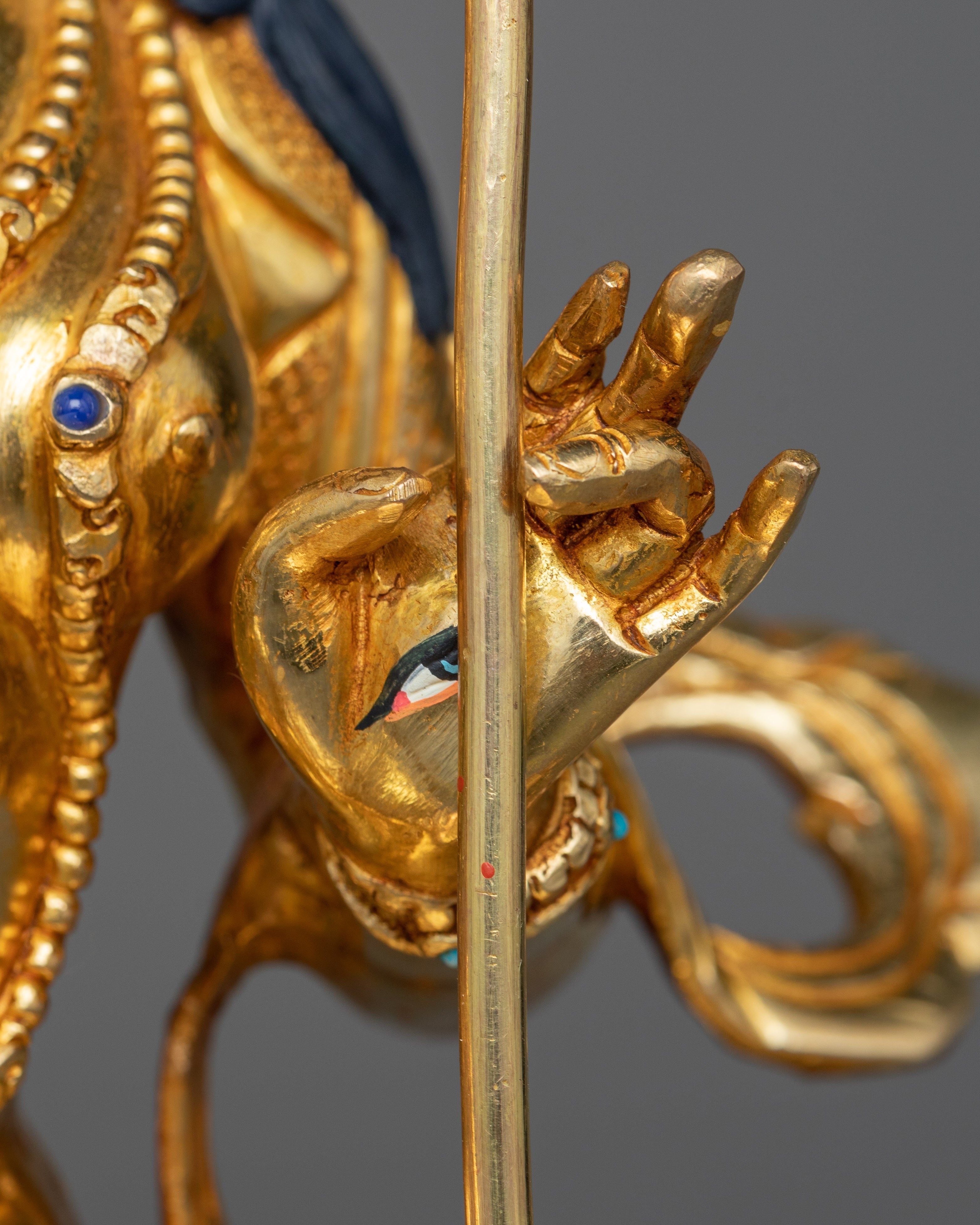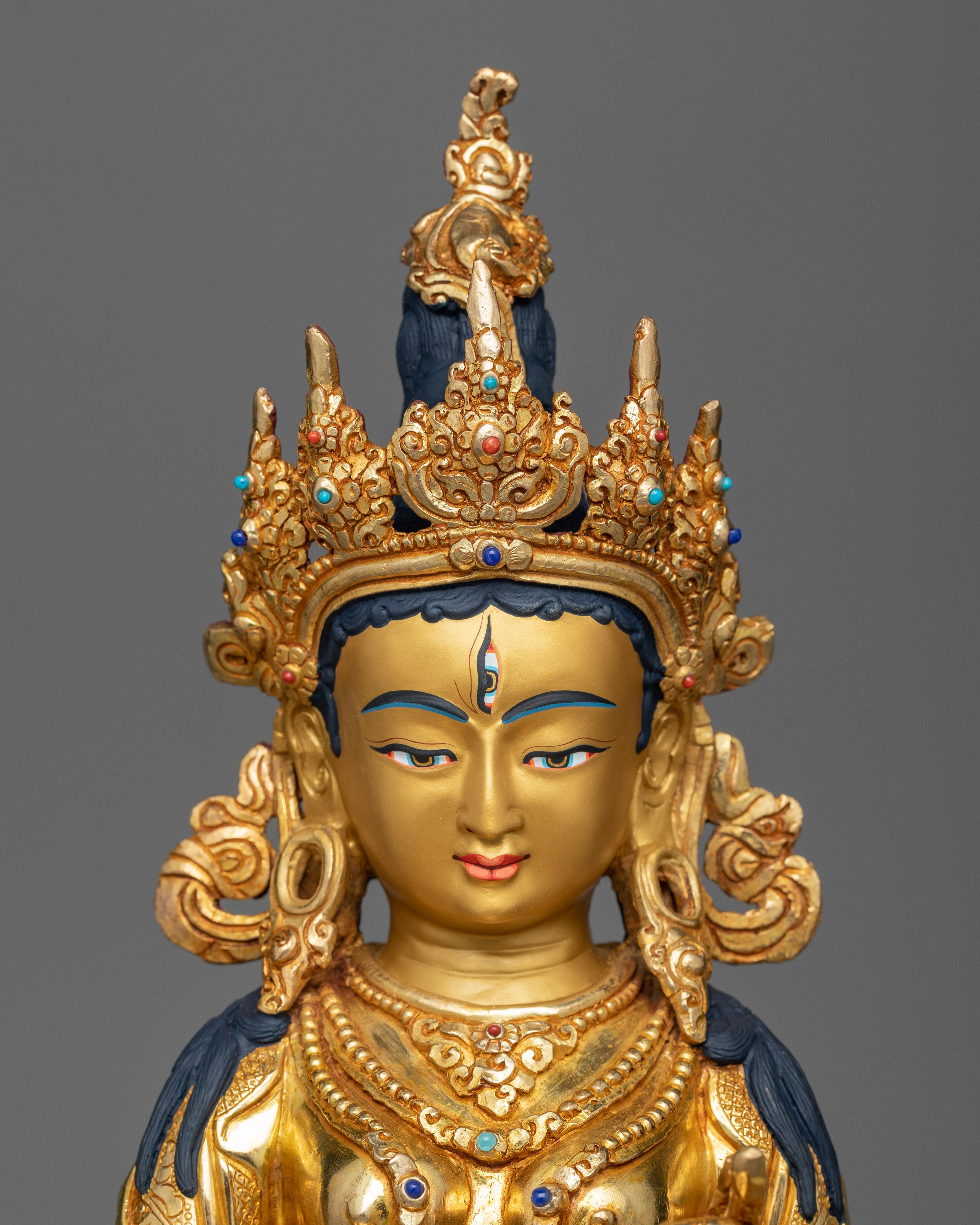 The word "Chatra" alludes to the lucky umbrella, an age-old representation of defense and regal graces that protect the goddess and her followers from misfortune and evil energy. The gold gilding illuminates Tara's figure, emphasizing her divine nature and the spiritual purity of her mission to protect all beings. The vibrant gold and acrylic paintings add depth and vibrancy, highlighting her benevolent expression and the rich symbolism surrounding her.