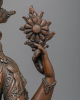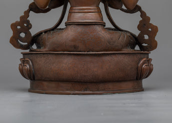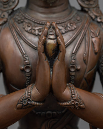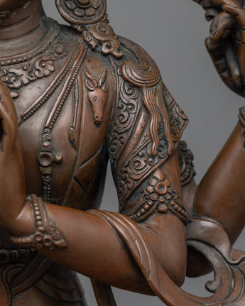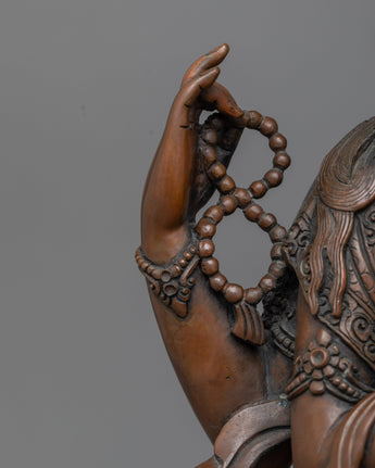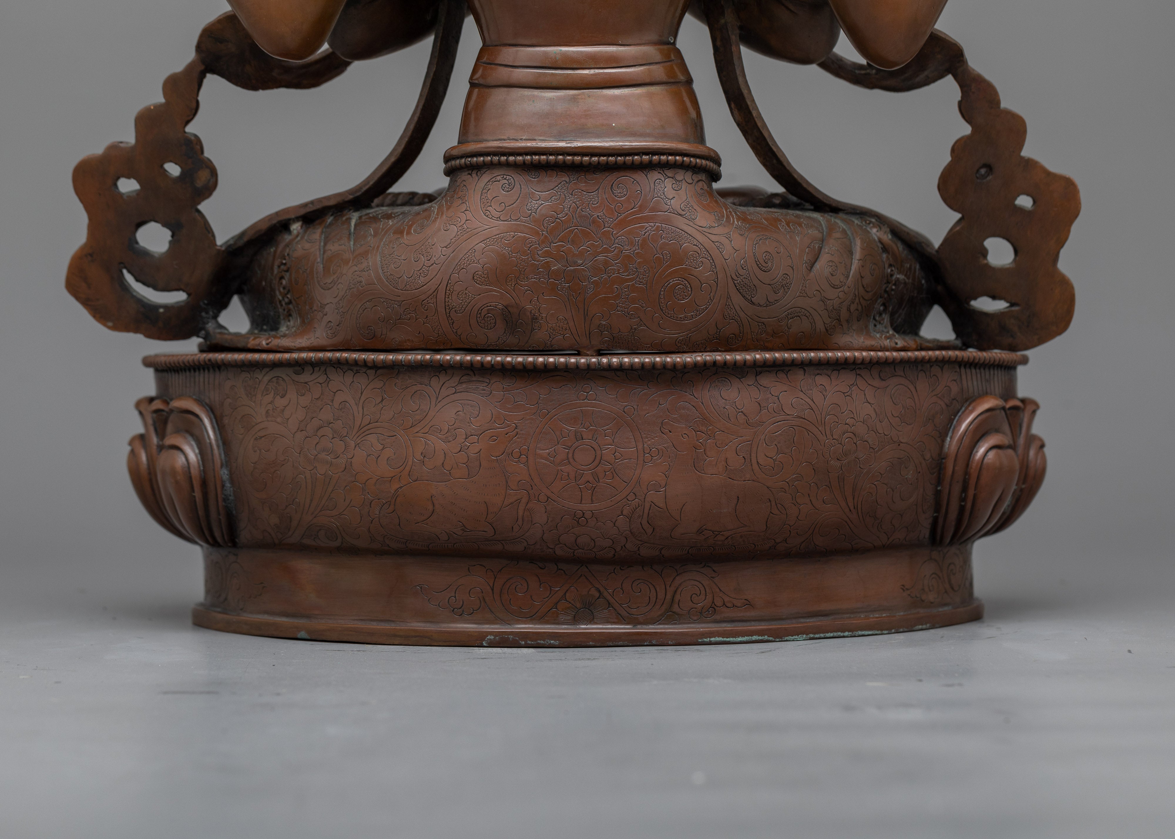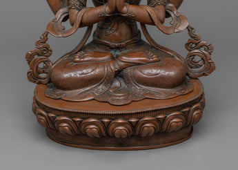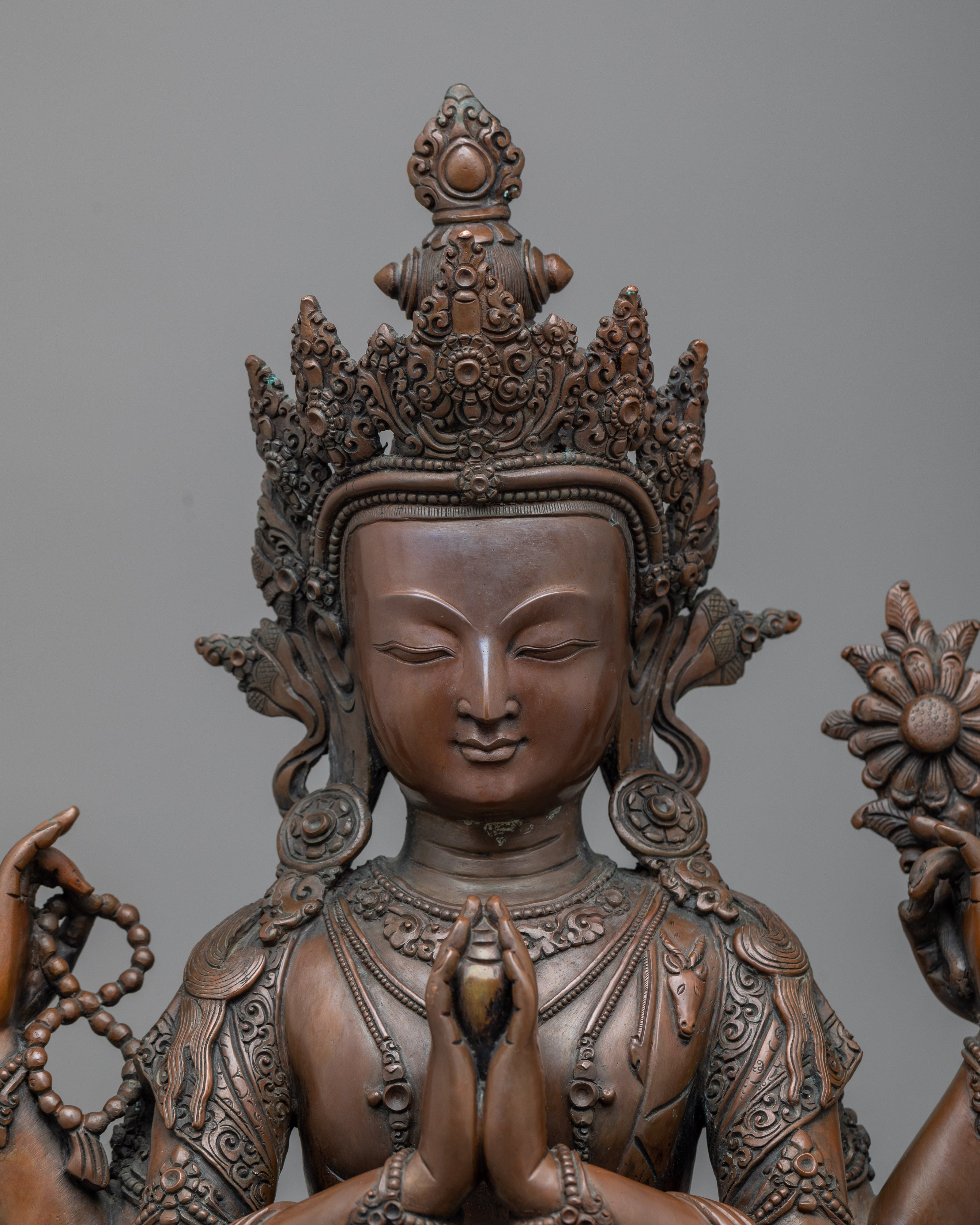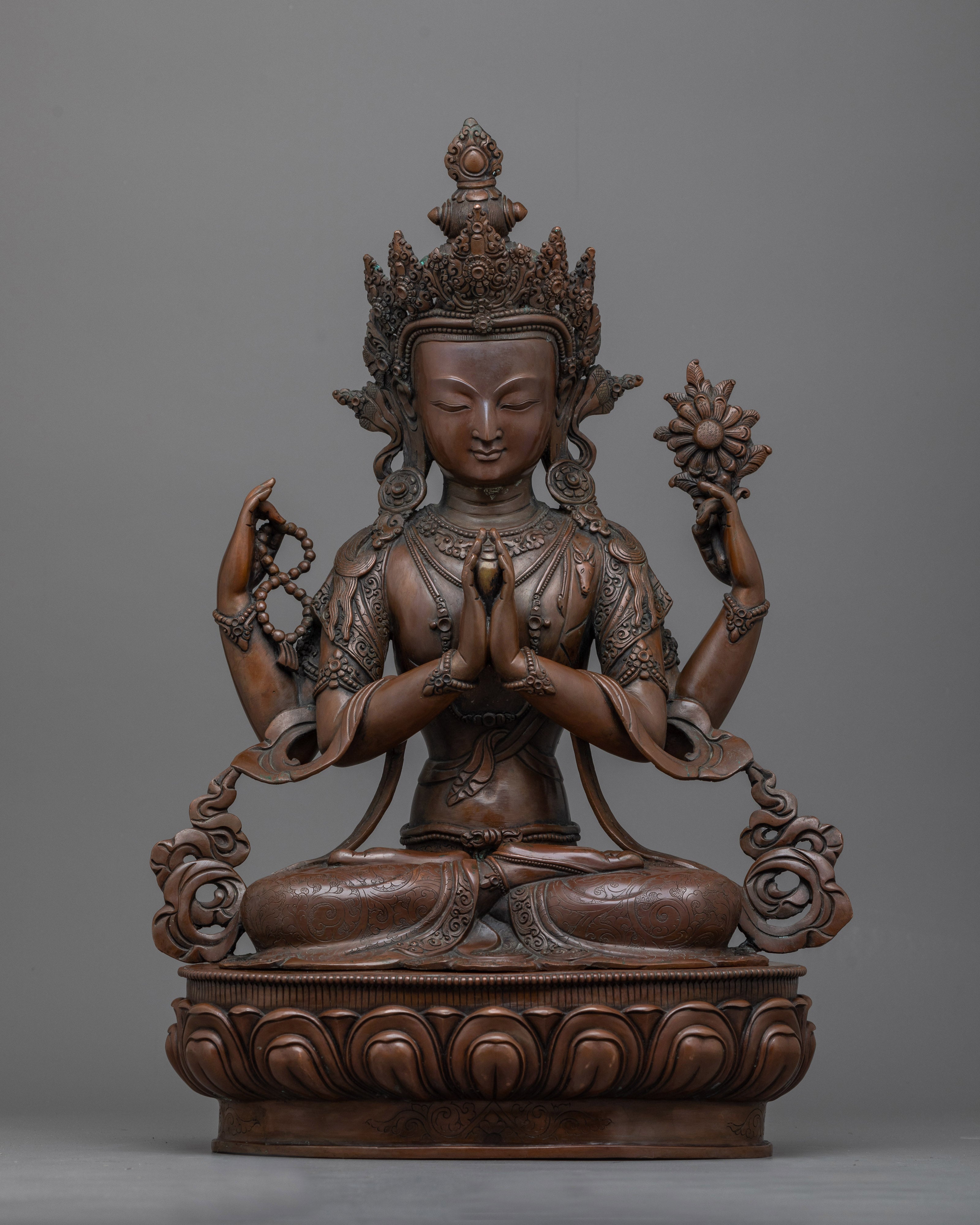 Avalokiteshvara, also known as Chenrezig, is regarded as the embodiment of all Buddhas' compassion; he takes on different forms to meet the needs of his followers. Known for his promise to stay in the samsaric worlds until all creatures attain freedom, Om Mani Padme Hum, a well-known six-syllable mantra, is used in his practice to cultivate compassion. Avalokiteshvara's compassion energy and boundless healing and protective potential are palpably connected to the Compassion Deity Sculpture, Chenrezig, which exquisitely captures the essence of the Buddha.