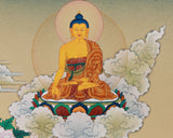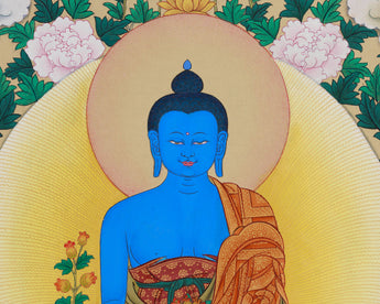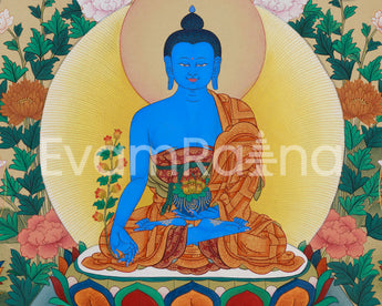An Eight Healing Buddhas thangka is a sacred artwork, meticulously hand-painted on cotton canvas with natural colors derived from Lhasa stone and enhanced with 24K gold. The mineral-based pigments from the holy region of Lhasa provide vibrant, long-lasting hues that bring each Buddha figure to life with spiritual clarity. The addition of 24K gold lends a radiant glow, symbolizing enlightenment and purity. It is created in the elegant Karma Gadri style, a traditional Tibetan technique characterized by flowing lines, balanced compositions, and serene landscapes.