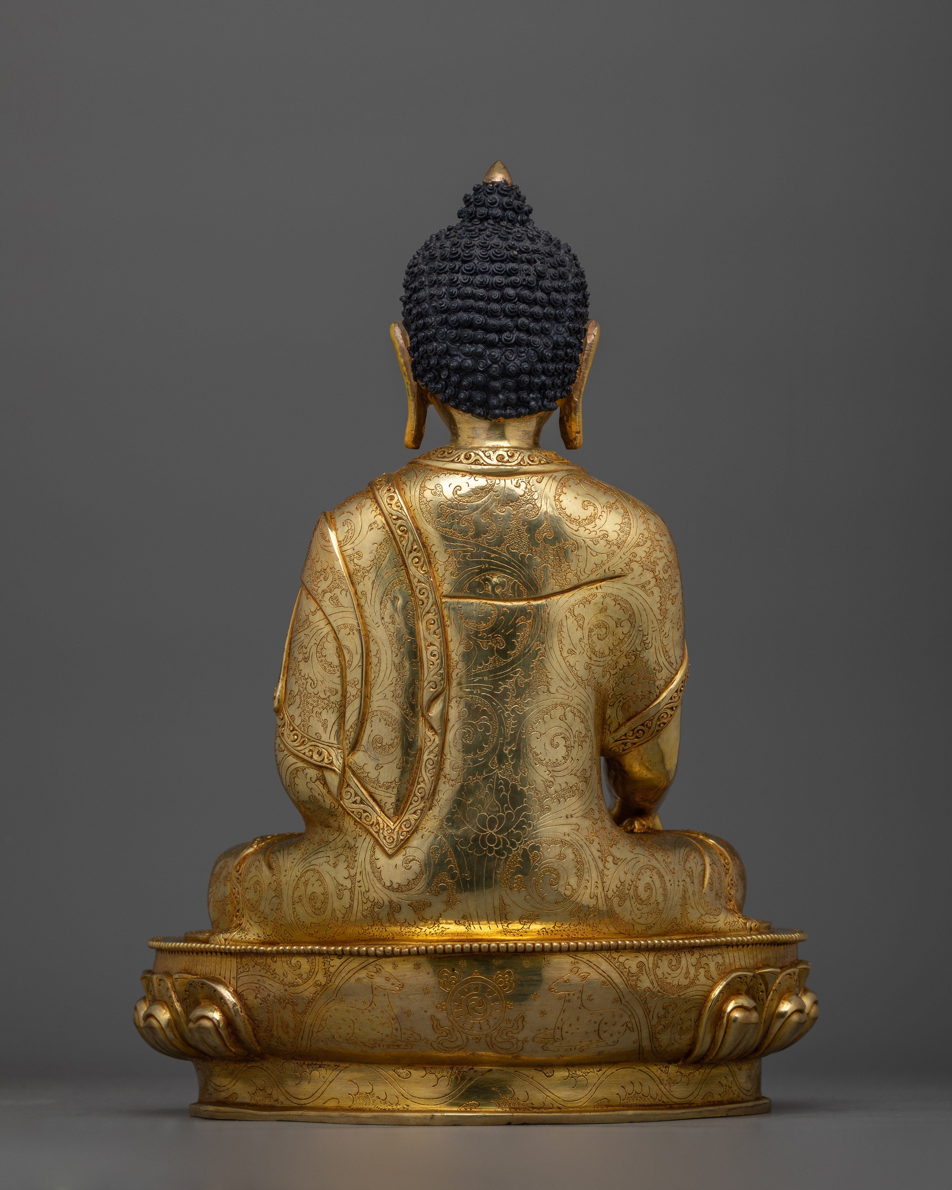 Shakyamuni's robes have intricate designs, and his face and hands have expressive characteristics that have all been skillfully sculpted. The sculpture has been given elegance and spiritual meaning by the artists' cautious attention to detail. The gold plating highlights the artists' superb skill in addition to signifying Shakyamuni Buddha's pure essence. For those looking for a work of art that captures the spirit of enlightenment and inner serenity, this statue is ideal.