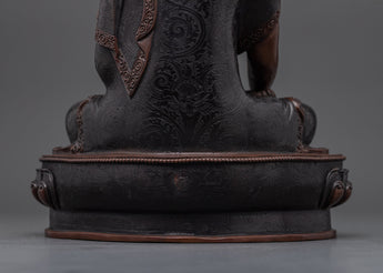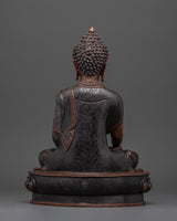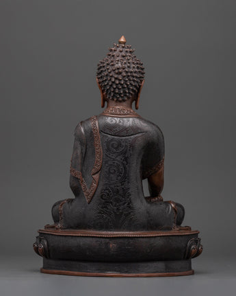 Standing at 13 inches in height, this Shakyamuni Buddha statue is cast in oxidized copper, giving it an antique finish that adds depth and character to the piece. The oxidization process enhances the intricate details of the Buddha’s robes, facial features, and the flowing contours of his seated posture. The Buddha is depicted in the bhumi sparsha mudra, his right hand touching the Earth, representing his victory over ignorance and his attainment of enlightenment.