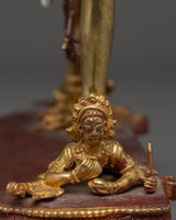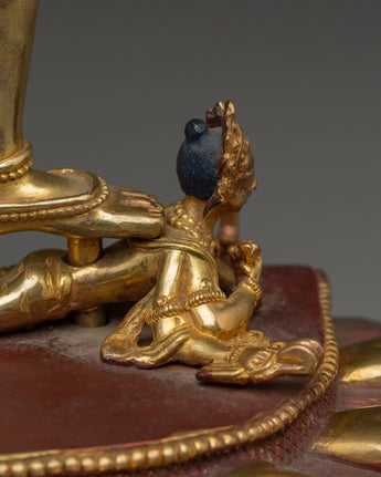This exquisite Buddhist Dakini Vajrayogini statue stands 40 centimeters tall and 29 centimeters wide, combining compact size with a commanding presence. Weighing 4.04 kilograms, its copper construction ensures fine detail, reflecting traditional Himalayan craftsmanship. The statue’s gold gilding radiates a sacred glow. Embrace the fierce wisdom of this revered Dakini through a striking piece that enriches any spiritual collection with divine energy and skillful artistry.