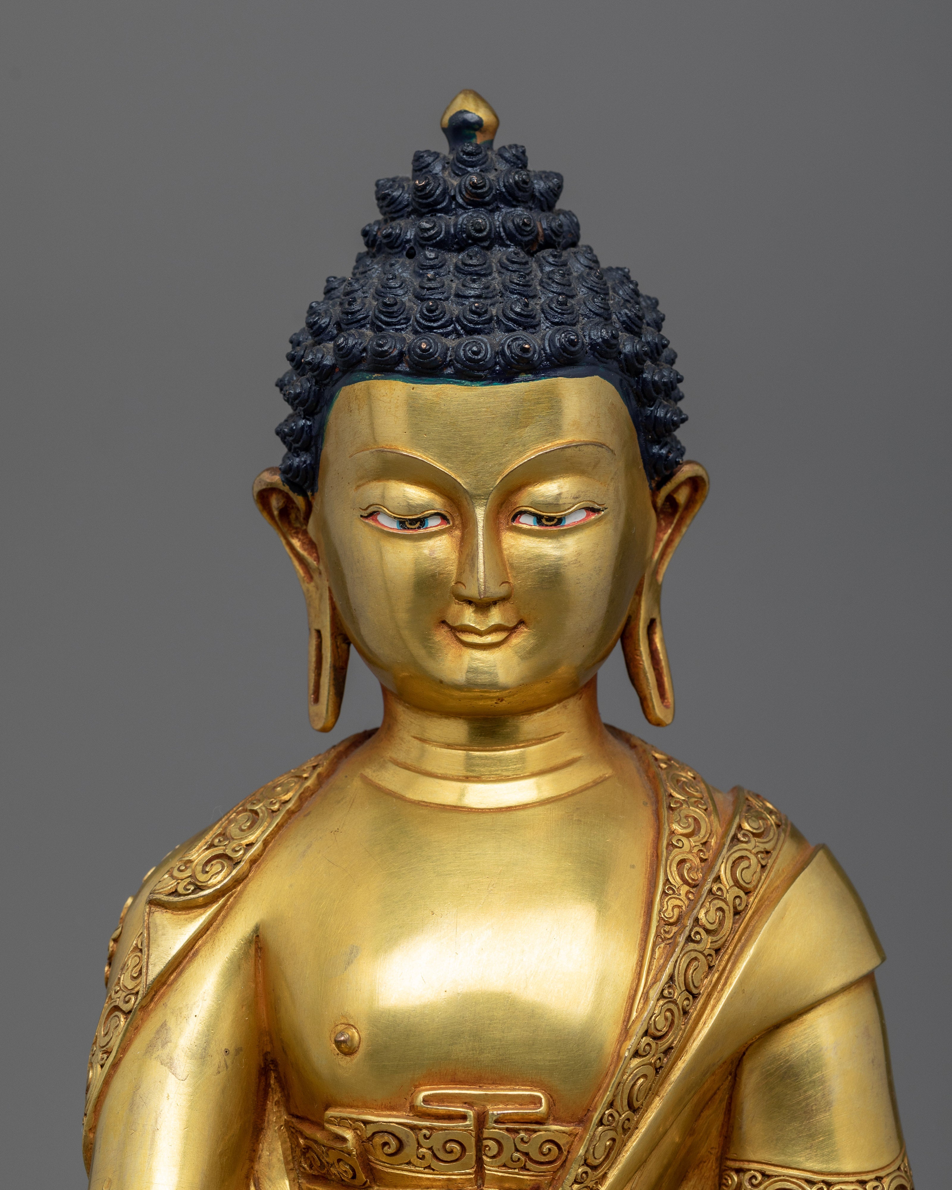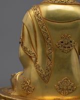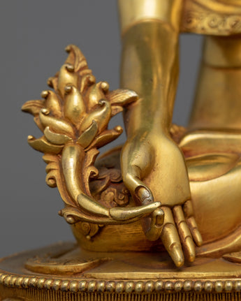 Presenting the Guru Medicine Buddha Sculpture, a calm depiction of the Buddha's healing nature. With a balanced height of 13.7 inches, a base measuring 9.8 inches, and weighing 5.70 kg, this sculpture represents the weighty presence of the Medicine Buddha's healing qualities. This sculpture, made of a copper body and embellished with 24K gold gilding and intricate acrylic paints, perfectly embodies the Medicine Buddha's healing spirit and tranquility.