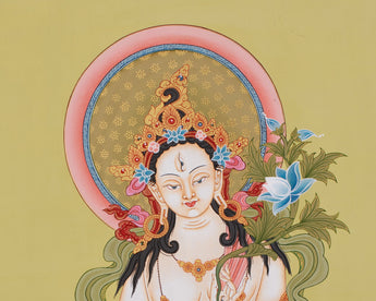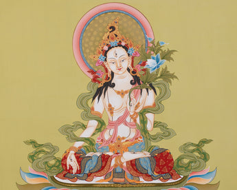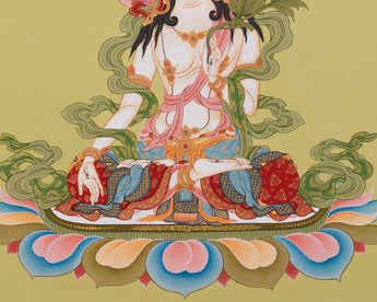 The Healing Deity, White Tara Thangka, a revered depiction of one of the most cherished figures in Tibetan Buddhism. She embodies divine serenity and protective grace. White Tara is called upon for her ability to enhance the lives of her devotees and offer swift protection from suffering. She symbolizes long life, healing, and infinite compassion. This thangka is hand-painted in the traditional Himalayan style by a skilled Nepali artist using cotton canvas, acrylic colors, and genuine 24K gold, ensuring unmatched quality and spiritual authenticity.