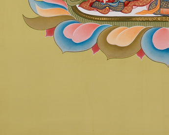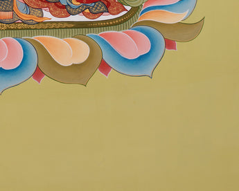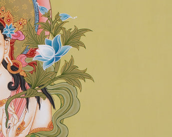 The background is softly tinted in olive, providing both spiritual grounding and visual tranquility. This backdrop enhances Tara's brilliance while upholding the painting's spiritual essence. Each brushstroke reflects meticulous attention to detail, preserving the beauty and symbolism of traditional iconography. It is a spiritual offering and a blessing of peace, health, and protection and is ideal for meditation rooms, healing spaces, or personal altars.