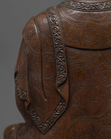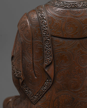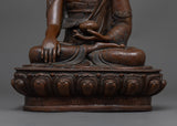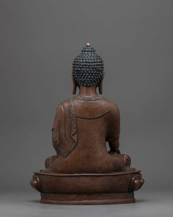 Shakyamuni, the historical Buddha, is seen in a traditional meditative stance, representing the serenity and introspection that led him to understand the essence of life and suffering. The oxidized copper lends the sculpture an air of timeless reverence, highlighting the intricate details that bring to life Shakyamuni's serene expression and the symbolic gestures of enlightenment and teaching.