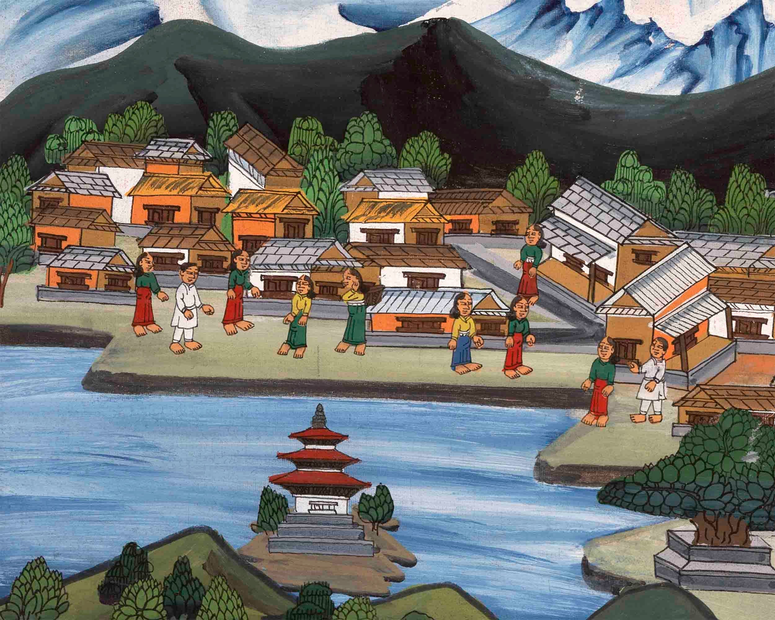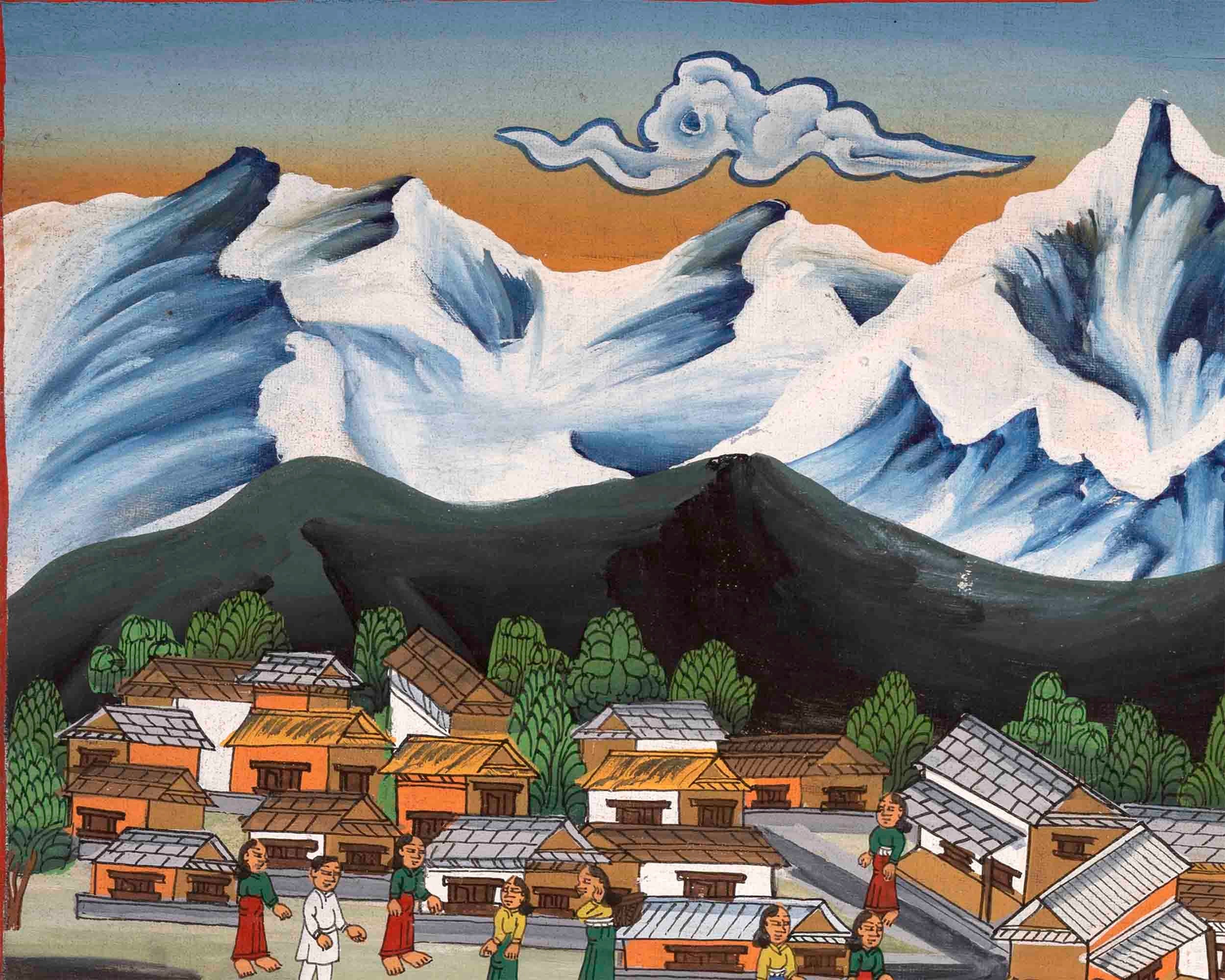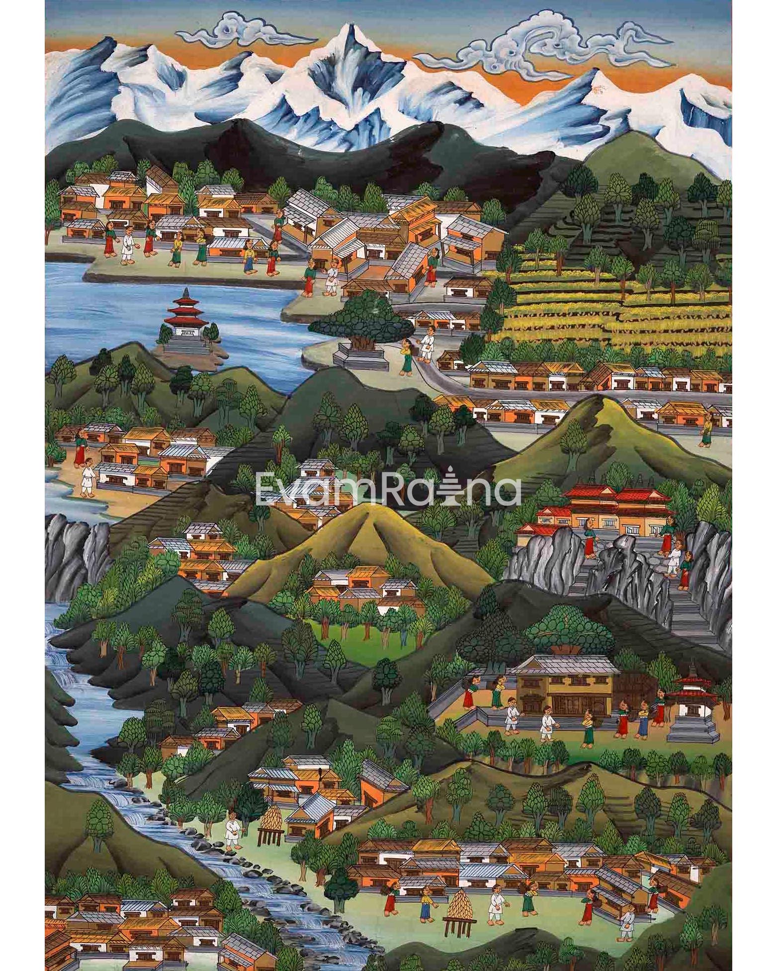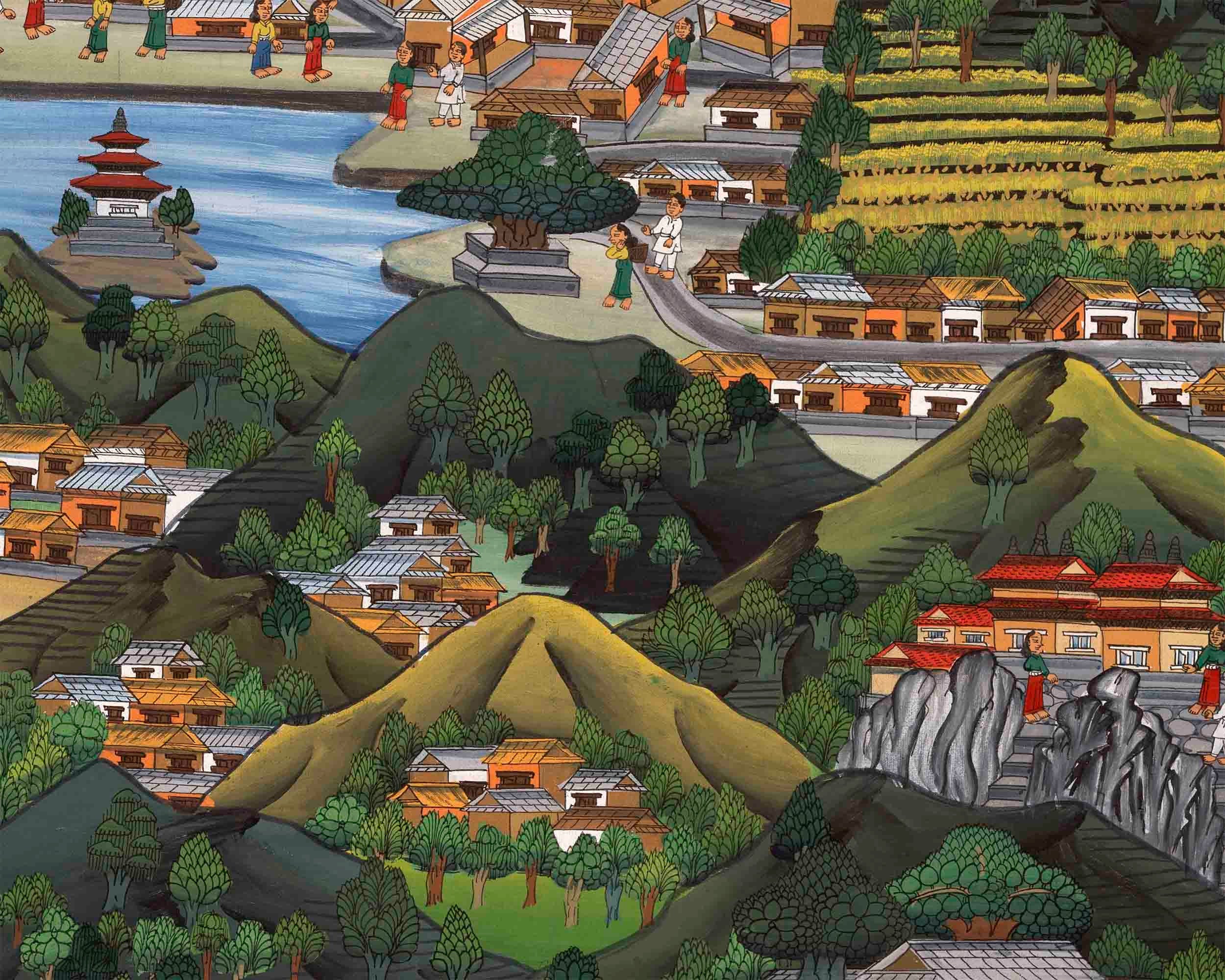 This vintage thangka portraying the Kathmandu Valley offers a captivating glimpse into the spiritual and artistic heritage of Nepal's cultural heartland. This unique artwork is more than a painting—it is a window into the soul of Kathmandu Valley's storied past. This thangka, with its intricate details and vibrant colors, reflects the rich tapestry of Buddhist and Hindu traditions that have flourished in the valley for centuries.