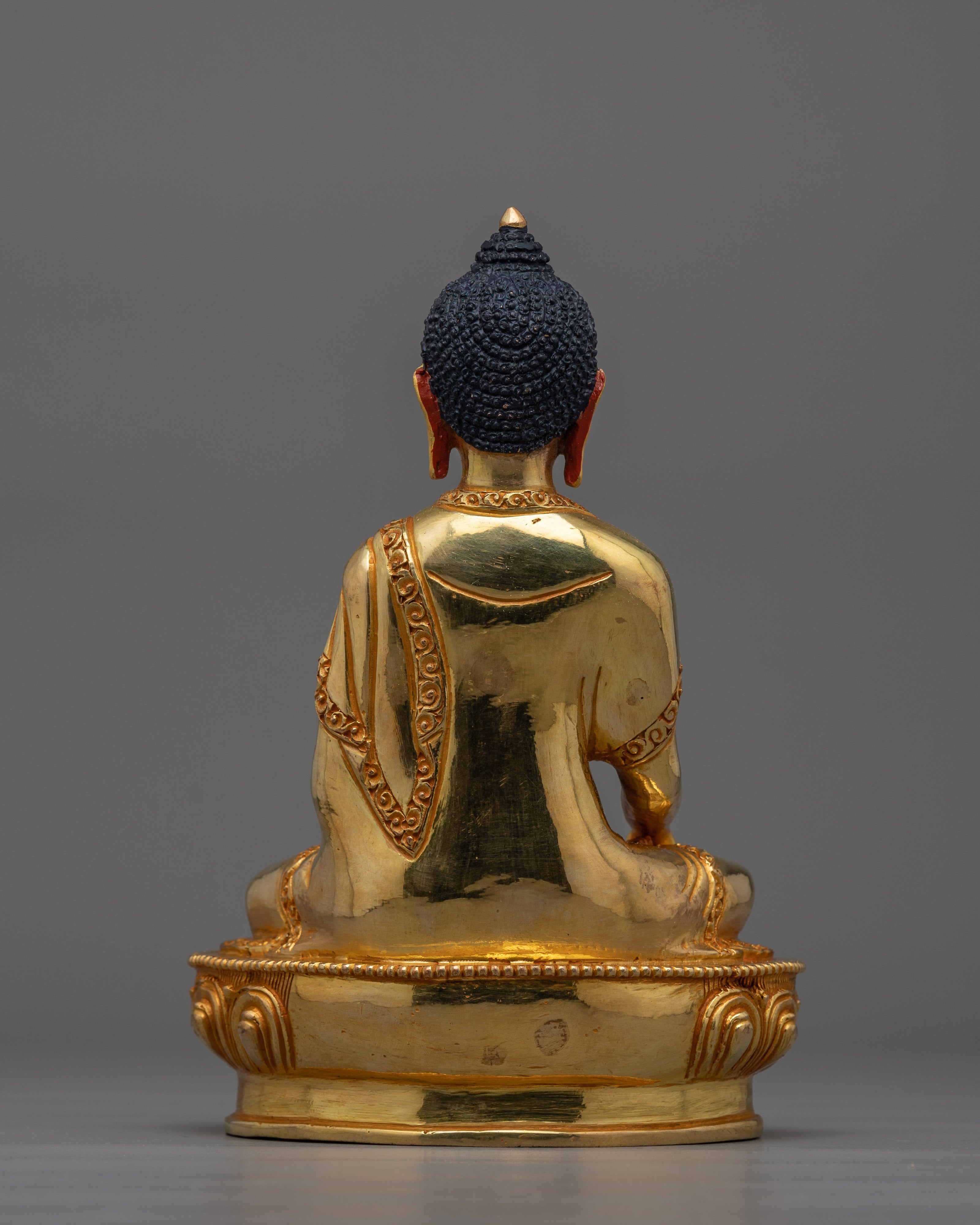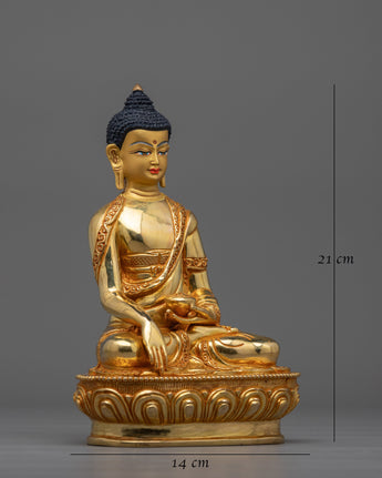 Welcome the serene presence of Lord Budha Shakyamuni into your sacred area. This finely carved statue, which stands elegantly at 8.3"/21cm tall and weighs 1.30 kg, radiates spiritual significance and aesthetics. The Shakyamuni Buddha statue, with its elaborate 24K gold gilded accents, gold and acrylic paintings, and copper body, is a powerful representation of compassion and enlightenment. Enter his celestial aura to begin your journey toward inner harmony and spiritual enlightenment.