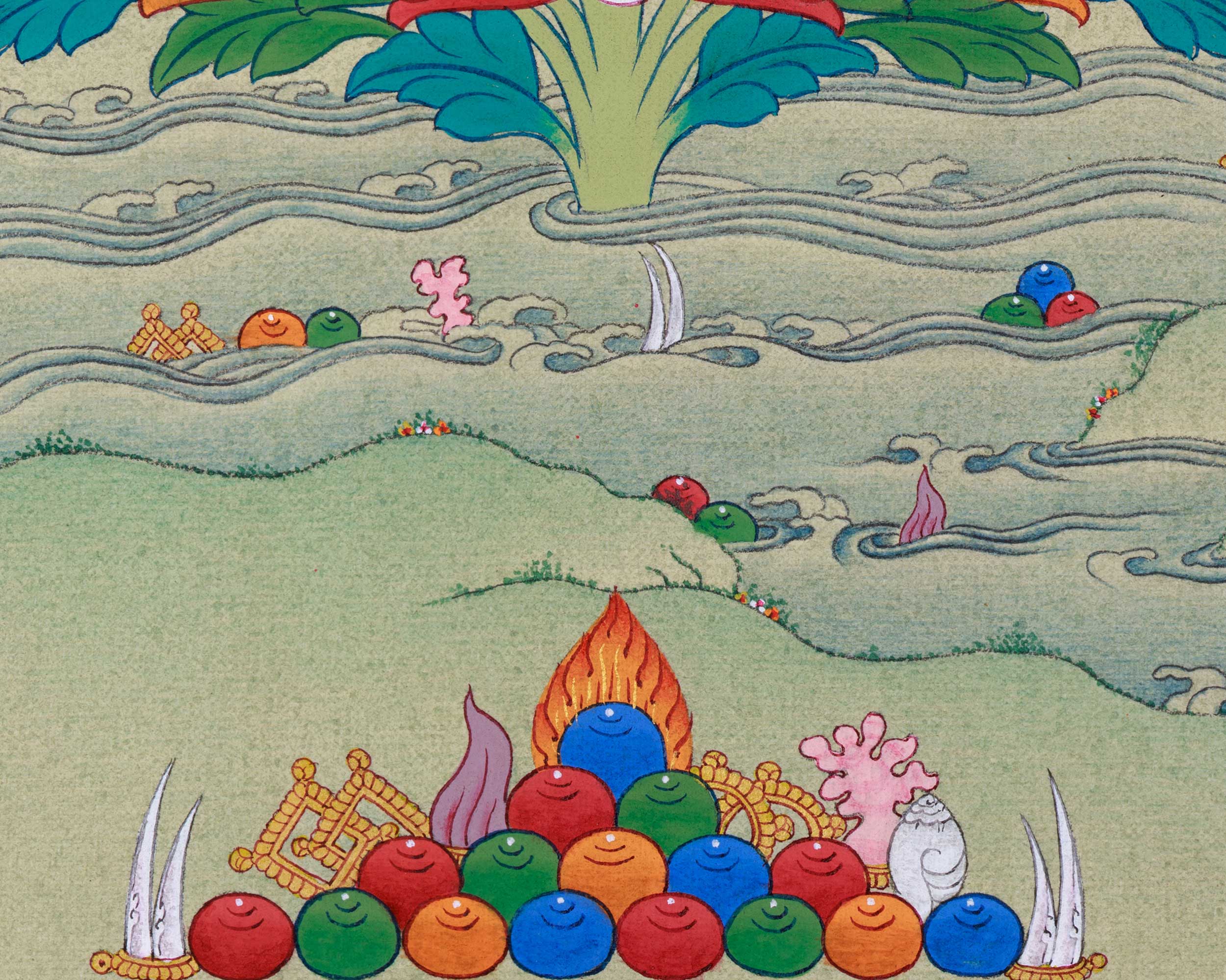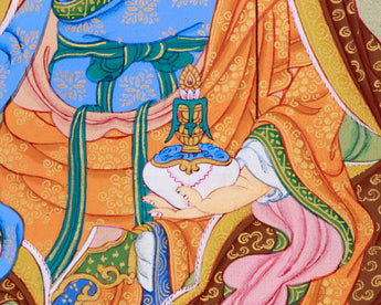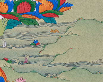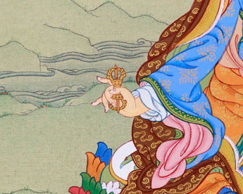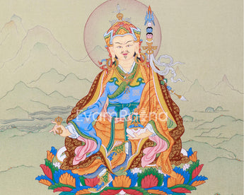 The Guru Rinpoche's Blessings In A Sacred Thangka, meticulously hand-painted on a cotton canvas with vibrant acrylic colors and embellished with 24K genuine gold, is a divine masterpiece that encapsulates the profound blessings of Padmasambhava, also known as Guru Rinpoche. Every brushstroke on this sacred artwork is infused with reverence and devotion, capturing the essence of Guru Rinpoche's enlightened presence. Adorned with intricate details and radiant hues, the Thangka depicts Padmasambhava in his transcendent form, emanating wisdom, compassion, and boundless blessings. The addition of 24K genuine gold further enhances the sacredness of the artwork, symbolizing the purity and luminosity of Guru Rinpoche's teachings. As a focal point for meditation or a cherished decorative piece, the Guru Rinpoche's Blessings In A Sacred Thangka serves as a conduit for spiritual connection and transformation, inviting devotees to bask in the radiant blessings of the Lotus-Born Guru and embark on a journey towards enlightenment.