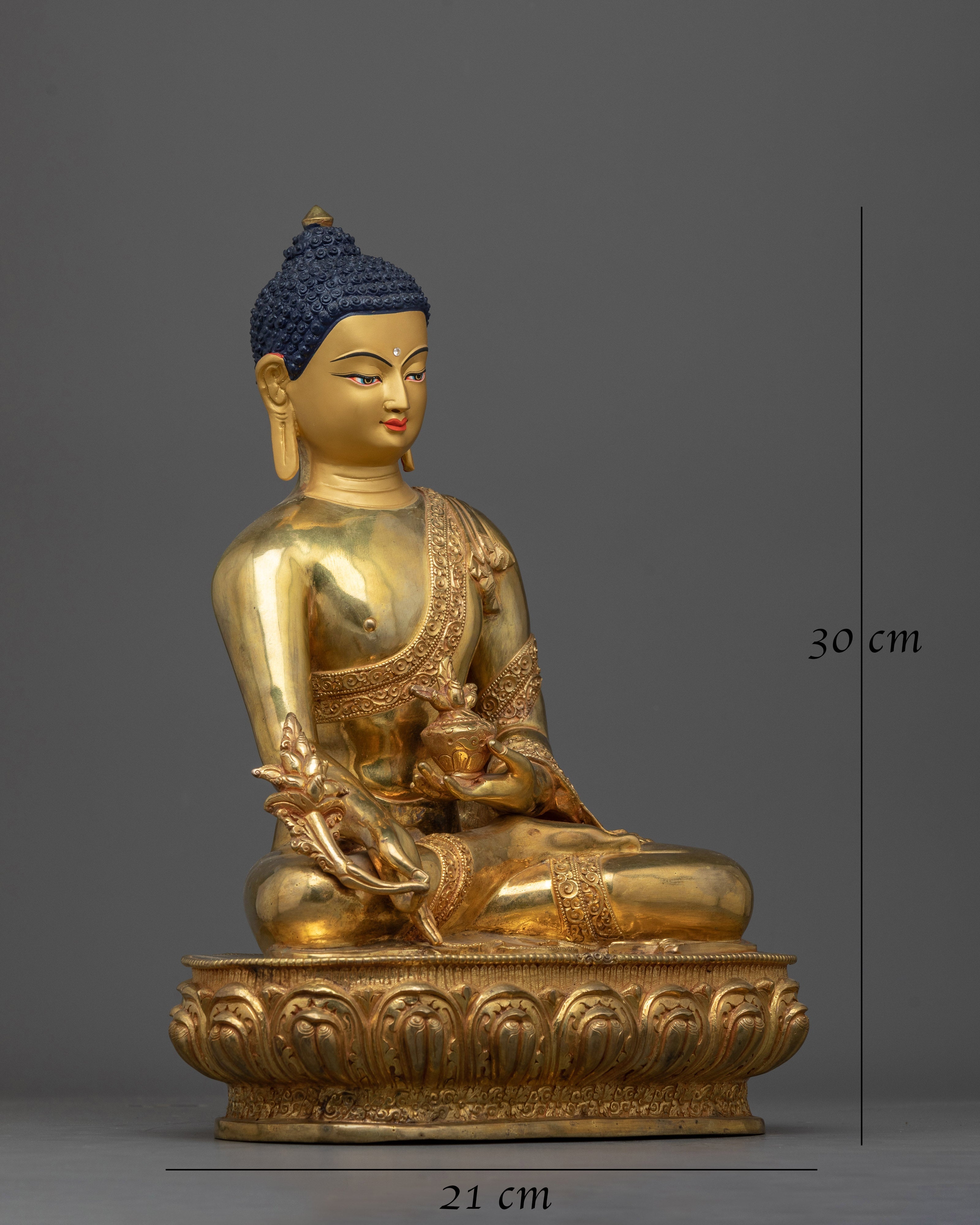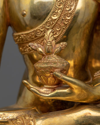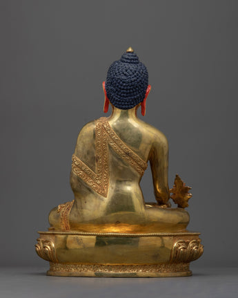 Presenting the Medicine Buddha Statue, a celestial representation of health and healing. This statue, which stands 11.8 inches tall and rests on an 8.2-inch base, weighs 3.12 kg and represents the Medicine Buddha's spiritual solid presence and healing ability. Crafted with skill from a copper body and embellished with 24K gold gilding, as well as intricate paintings in gold and acrylic, this piece embodies the calm and understanding nature of the Medicine Buddha, also referred to as Bhaisajyaguru in Sanskrit.