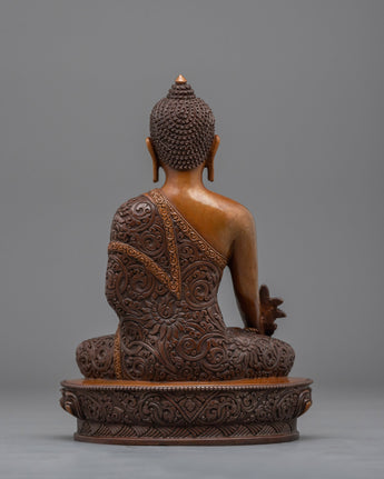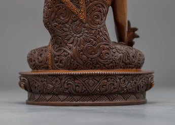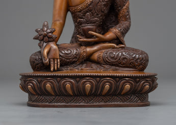 Take in the healing energies of the Medicine Buddhah statue. This stunning work of art, measuring 8.7"/22 cm and weighing 1.60 kg, is a perfect representation of spiritual well-being and compassion. The statue was diligently and precisely crafted, and it has an oxidized copper body with elaborate carvings that represent the healing power's transformational potential. With great care, every detail has been carved to arouse feelings of calm and healing energy, beckoning you to partake in the profound benefits of spiritual wellness.