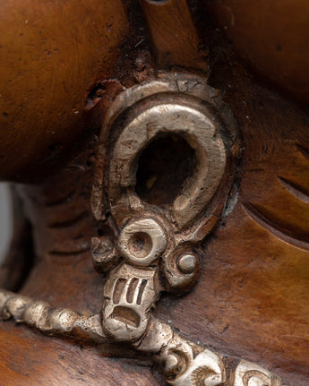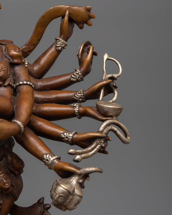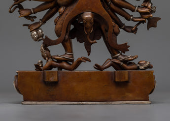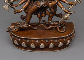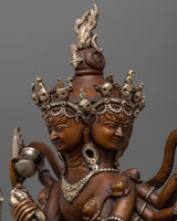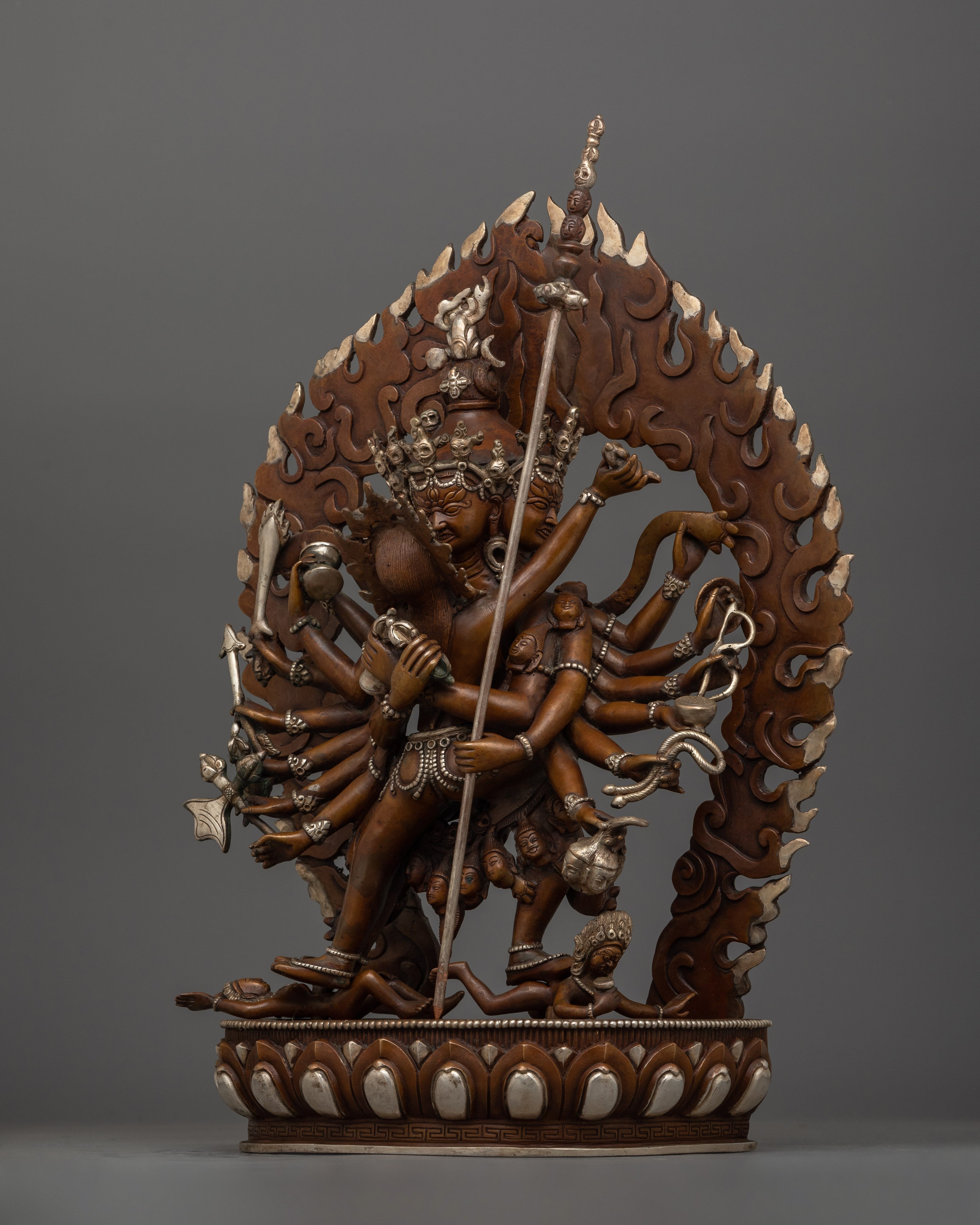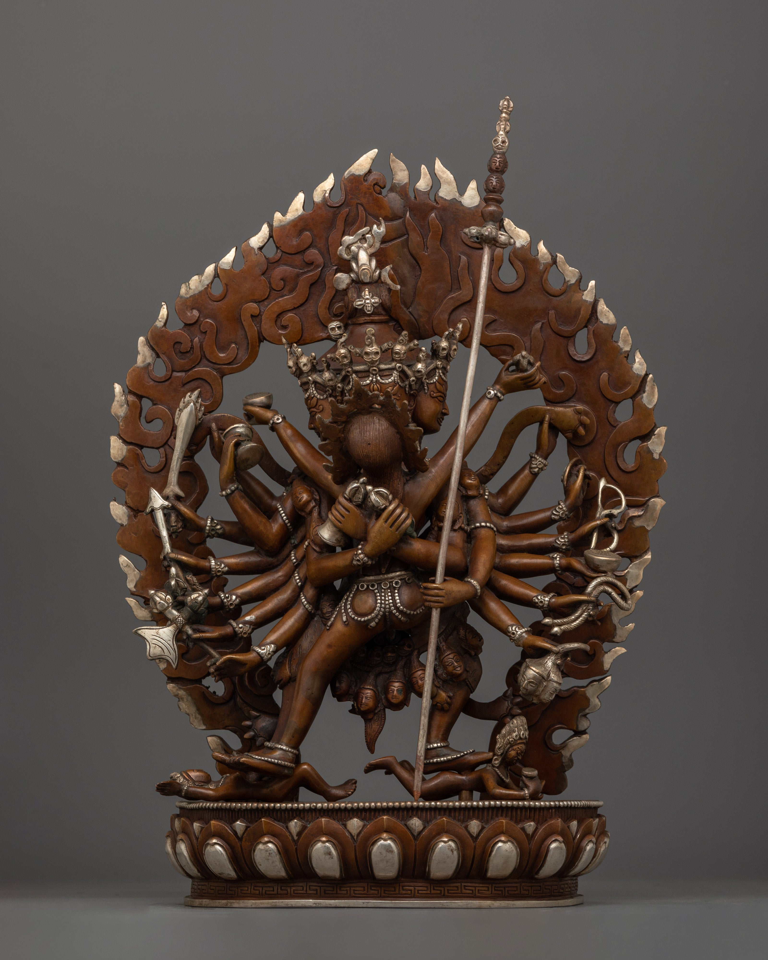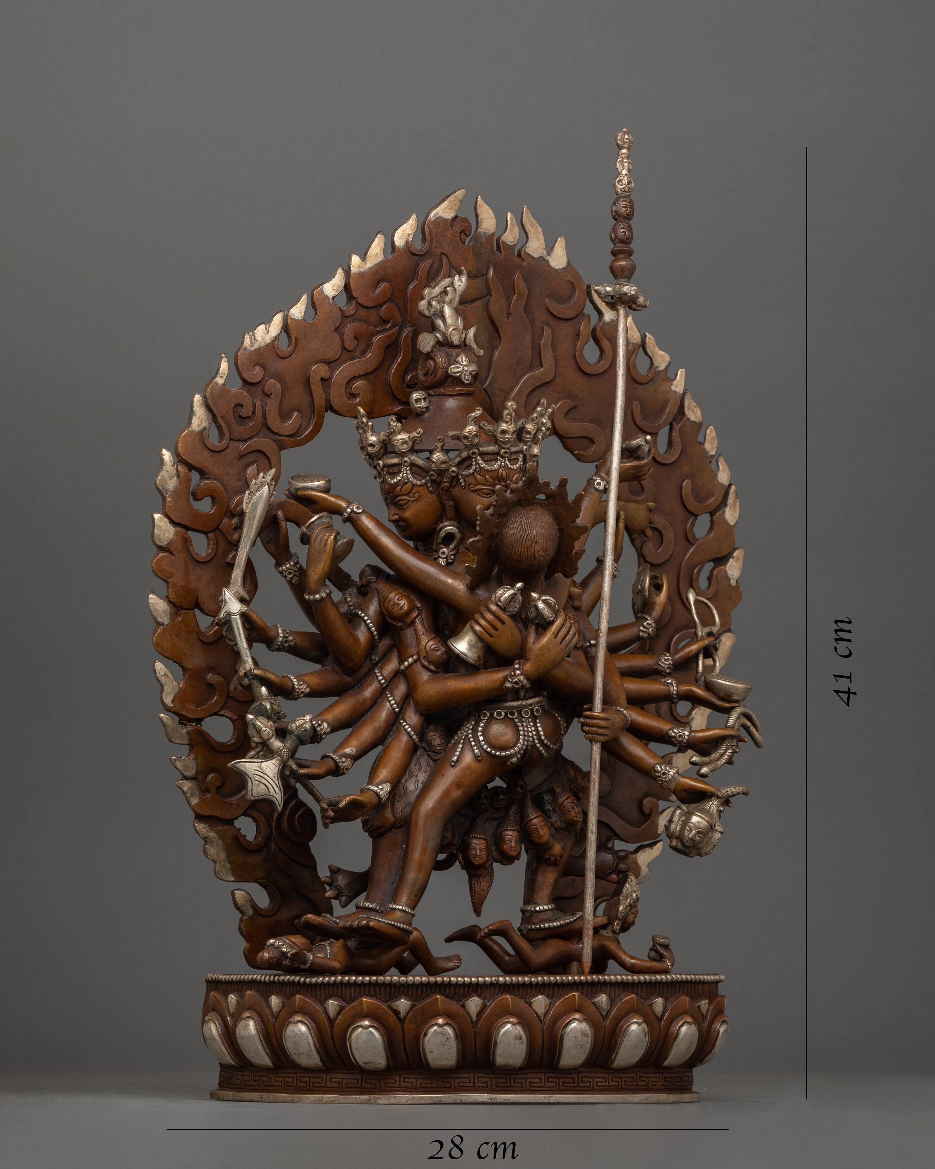 The Chakrasamvara with his consort statue, measuring 16.1 inches (41 cm) in height and with a base width of 11 inches (28 cm), is a representation of this powerful tantric deity. Crafted from oxidized copper, the statue is further enhanced with a silver-plated finish. Chakrasamvara, depicted in his wrathful form, embodies the transformation of negative energies into wisdom and compassion.