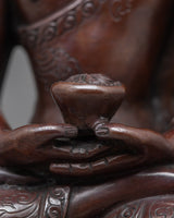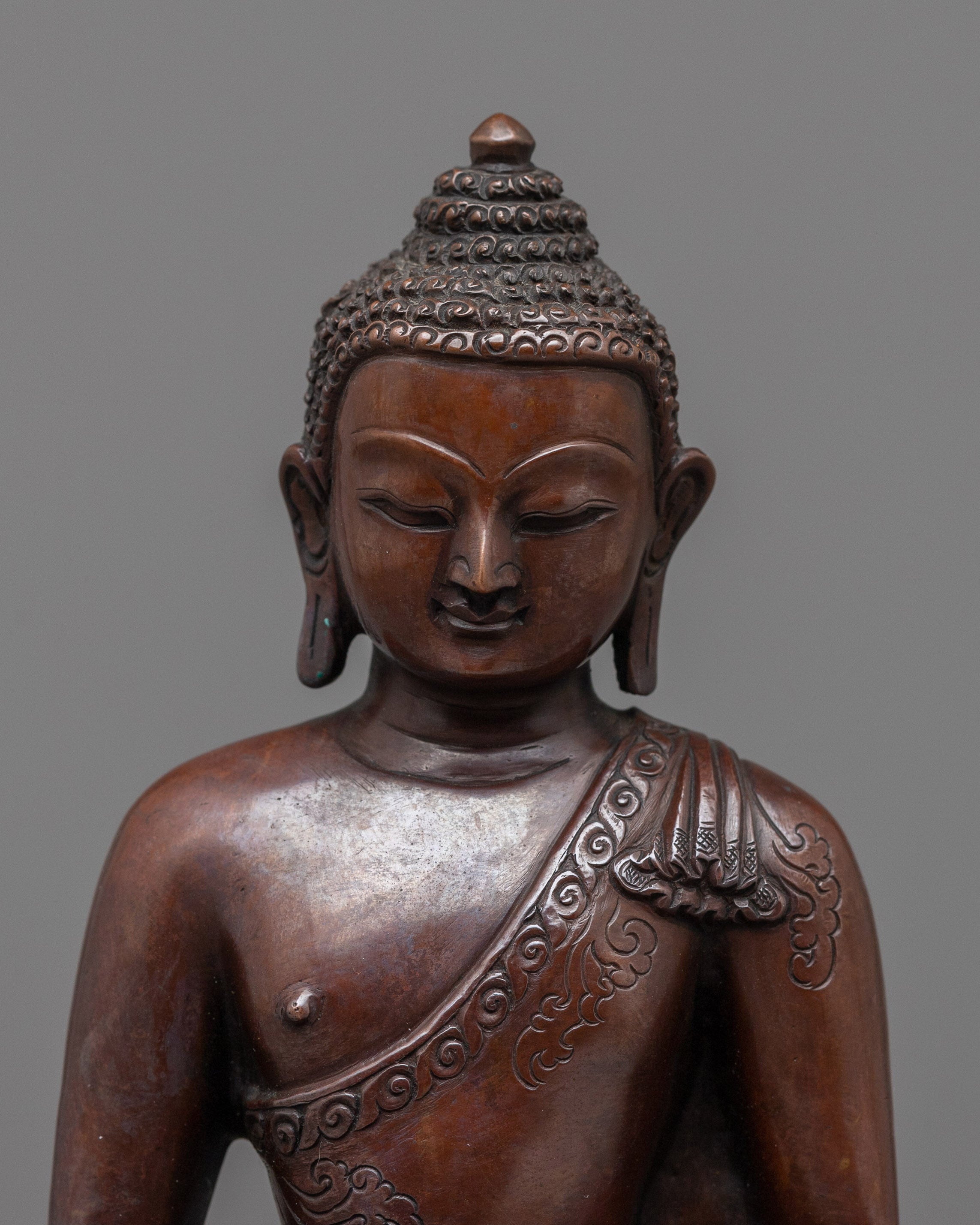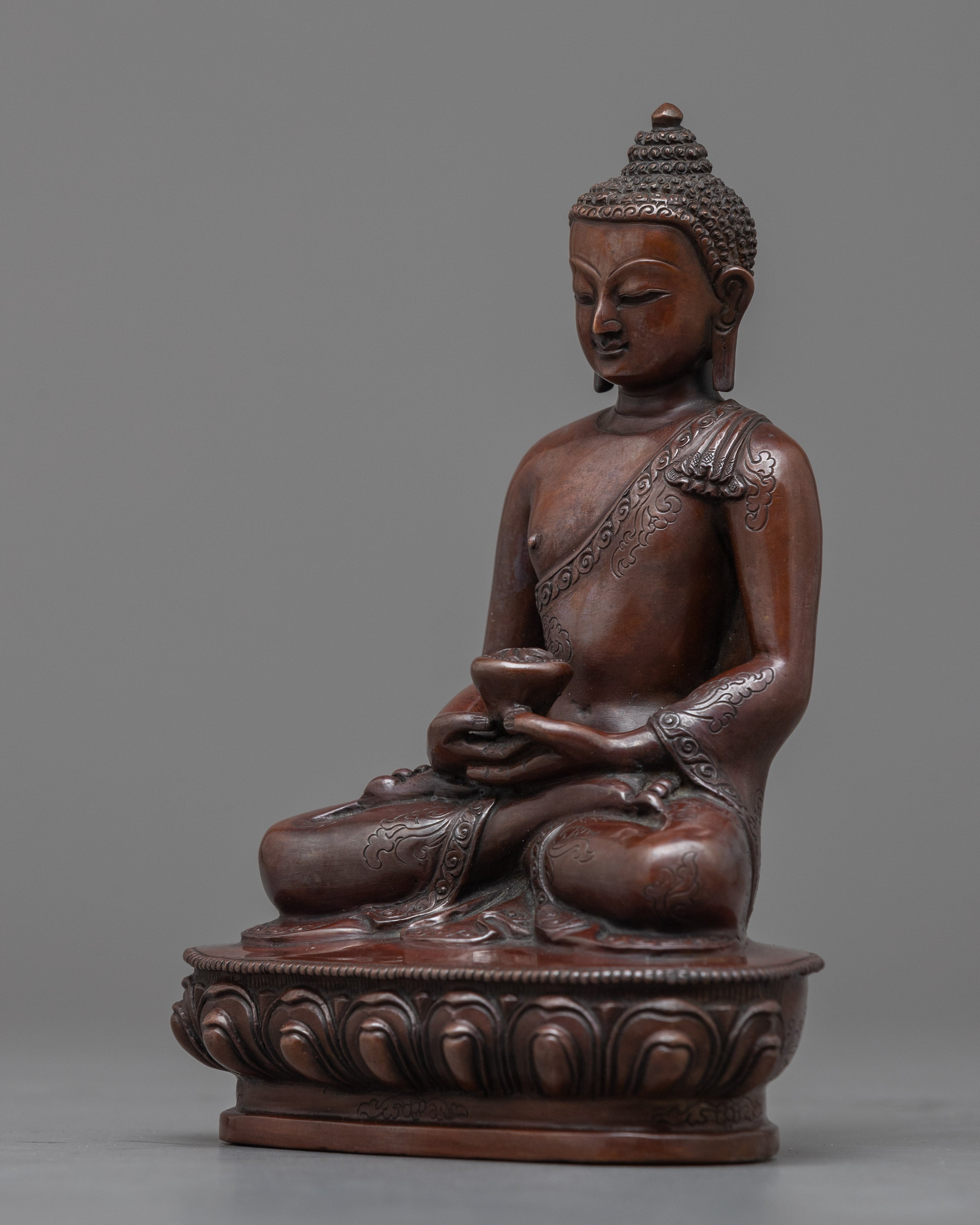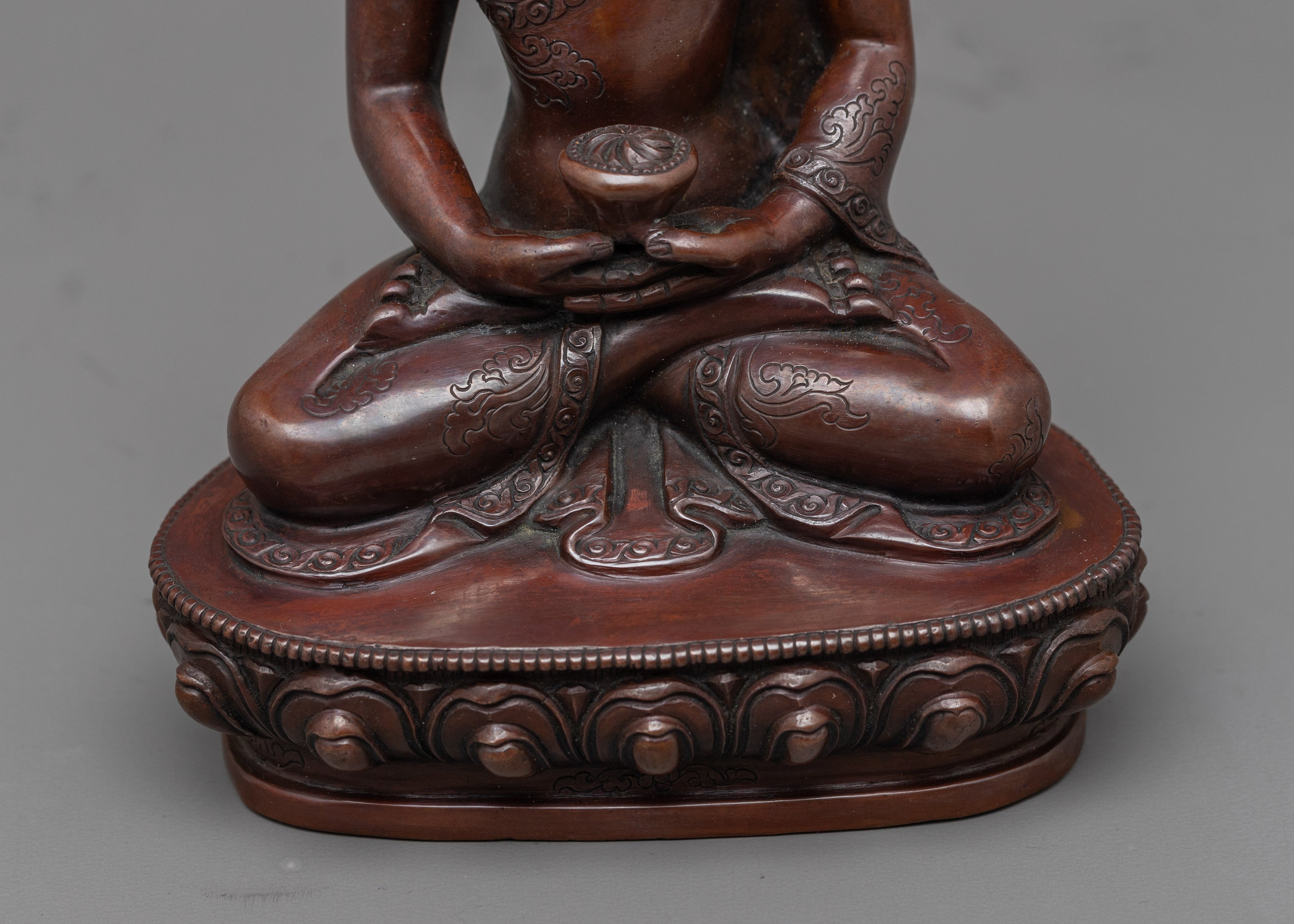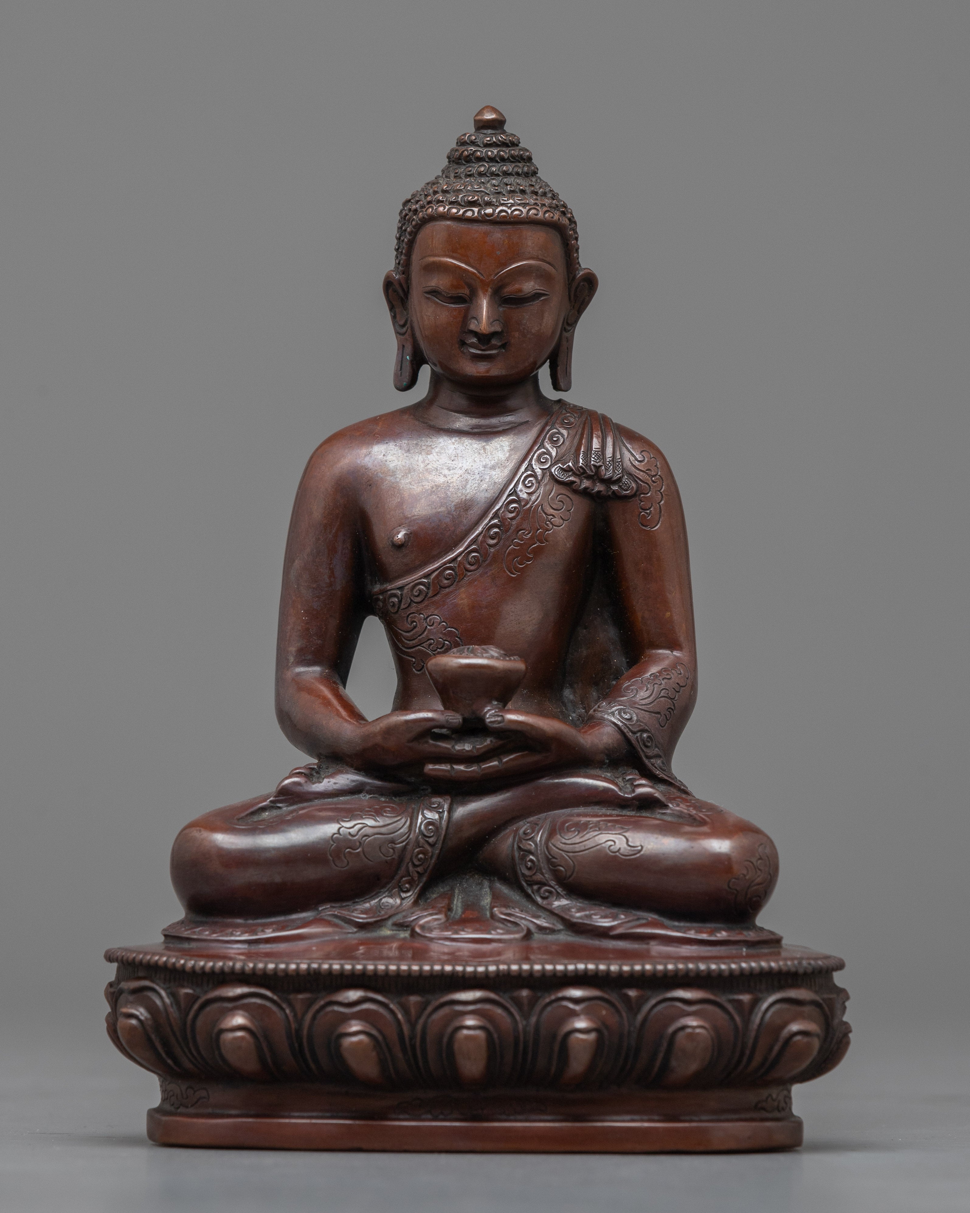 The powerful spirit of the Pure Land Buddha Statue will enhance your sacred environment. This magnificent work of art, which stands 5.5"/14cm tall and weighs 0.570 kg, has an exquisitely carved oxidized copper body. Blessing your surround with his transformational presence is the Pure Land Buddha, who is revered in Buddhist tradition as the personification of tranquility and spiritual enlightenment.