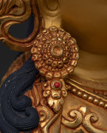Standing at 15 inches in height, this Guru Rinpoche statue is meticulously gilded with 24K gold, giving it a radiant and sacred glow. Depicted seated in a regal posture, Guru Rinpoche holds the vajra (thunderbolt) in his right hand, symbolizing his indestructible power, and the skull cup in his left hand, which represents spiritual transformation. His serene yet powerful expression embodies the qualities of wisdom and compassion.