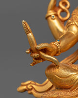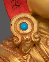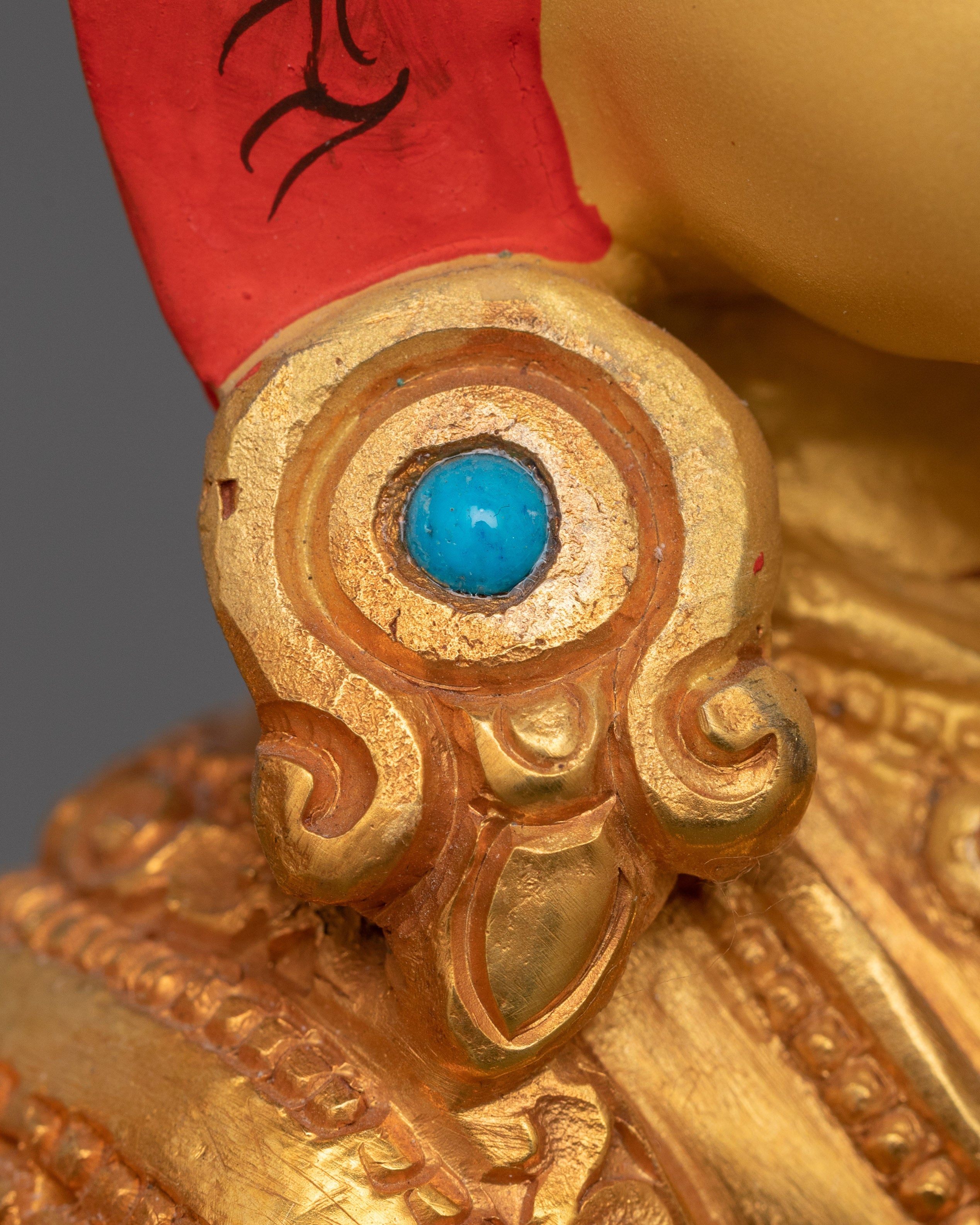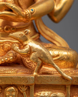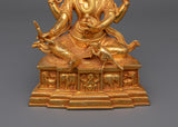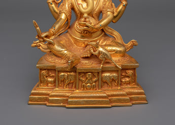 This Shivas Son Ganesha statue Known as the remover of obstacles stands at a height of 9.3 inches (23.5 cm) and features a base width of 7.1 inches (18 cm). It is adorned with 24K gold gilding and enhanced by gold and acrylic paintings, creating a vibrant and spiritual appearance. Made from a durable copper body, this statue combines traditional craftsmanship with enduring quality.