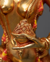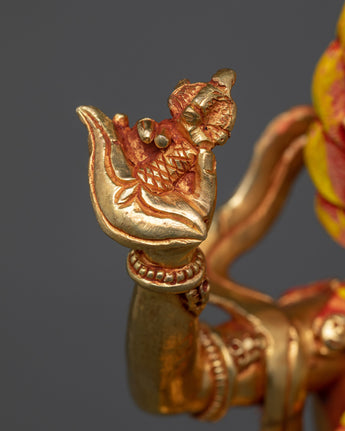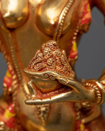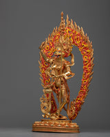 With our Simhamukha Practice statue, you can get a little closer to a world full of spiritual riches and visual magnificence. This incarnation of celestial craftsmanship reflects the culture of Nepalese creativity, in which every element tells a story of tradition, spirituality, and exquisite attention to detail. This sculpture is a wonderful blend of elegance and spirituality, with a rich coating of 24k gold gilding and colorful acrylic paints.